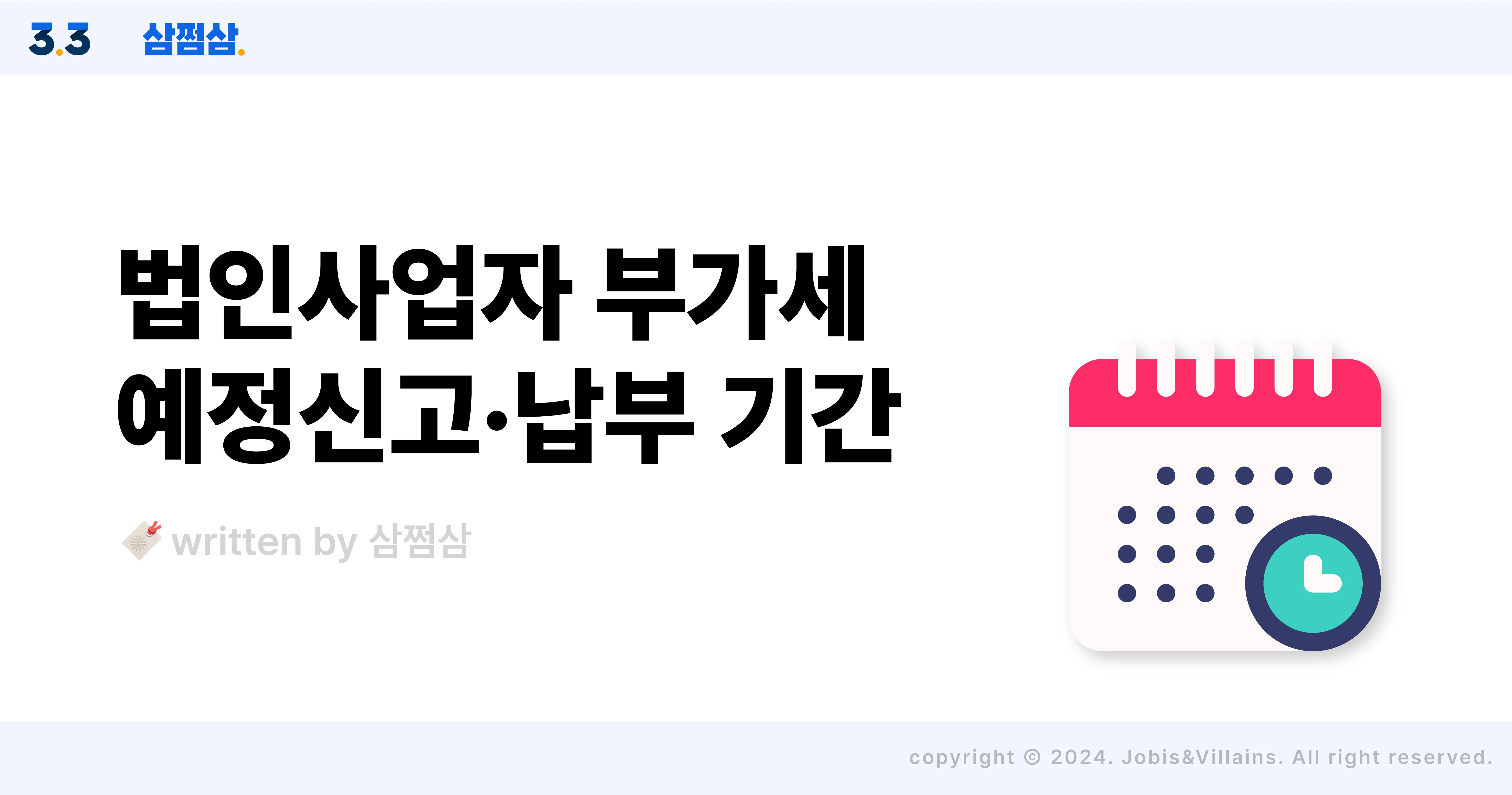 법인사업자 부가세 예정신고 기간(예정고지 차이점) 법인을 운영하는 사장님들이라면 법인세 신고로 한창 정신이 없으실 거예요. 법인세 신고가 끝나고 한숨 돌려야지 싶었다면 잠시만 미뤄주세요. 법인세 신고 기간이 끝나면 바로 부가세 예정신고가 기다리고 있거든요. 오늘은 법인 부가세 예정신고에 대한 큰 틀을 간략히 짚어보도록 할게요! 1. 부가세 예정신고 예정고지 다른 건가요? 부가세 예정신고와 부가세 예정고지. 다른 말인 것 같긴 한데 머릿속에 개념을 딱 정리해 두지 않으면 부가세 신고 기간마다 헷갈릴 수 있어요. 부가세는 확정신고와 예정신고 두 가지로 나누어요. 1년에 두 번 있는 확정신고 사이에 1번씩 예정신고 기간을 두어 부가세를 나누어 낼 수 있게 만들어 놓은 제도죠. 그런데 이 '예정신고'라는 건 법인사업자에게만 해당되는 내용이에요. 즉, 법인 부가세 신고는 1년에 4번 있는 셈이에요. 그럼 '예정고지'는 뭘까요? '고지'라는 단어에서 느낌이 오죠? 내가 신고를 하는 게 아니라 정해진 금액이 고지되어 납부만 하면 되는 거예요. 고지된 금액을 내기만 하면 되니 편리하지만 이건 개인사업자나 소규모 법인사업자(직전 과세기간 공급가액의 합계액이 1억 5천만 원 미만)에게만 해당되는 내용이랍니다. 📍단, 이런 경우에는 예정고지 대상자에서 제외될 수 있어요. 징수 금액이 50만 원 미만 과세기간 개시일 현재 간이과세자에서 일반과세자로 전환된 사업자 휴업 또는 사업 부진으로 사업 실적이 악화되거나 조기환급을 받고자 예정신고를 하면 예정고지 취소 2. 법인사업자 부가세 예정신고 기간 법인사업자는 확정신고 외에도 예정신고까지 신경 써야 해요. 예정신고는 확정신고 사이 3개월간의 매출세액에서 매입세액 뺀 금액을 신고 및 납부해 주시면 되는데요. 확정신고 시 예정신고 납부세액만큼 차감한 금액을 납부하시면 됩니다. 그럼 언제까지 부가세 예정신고를 하면 될까요? 법인세 신고가 마무리되는 4월 1일 부가세 예정신고가 다시 시작된답니다. 4월 1일~4월 25일까지 부가세를 신고하고 납부까지 마무리해 주세요! 과세기간 과세대상 기간 신고 납부 기간 신고 대상 제1기1.1~6.30 예정신고 1.1.~3.31 4.1.~4.25 법인사업자 확정신고 4.1.~6.30 7.1.~7.25 법인사업자 1.1.~6.30 7.1.~7.25 개인 일반사업자 제2기7.1~12.31 예정신고 7.1.~9.30 10.1.~10.25 법인사업자 확정신고 10.1.~12.31 다음 해 1.1.~1.25 법인사업자 7.1.~12.31 다음 해 1.1.~1.25 개인 일반사업자 3. 부가세 예정신고 방법 법인사업자 역시 개인사업자와 마찬가지로 홈택스에 접속해 부가세 신고를 진행할 수 있어요. step 1. 홈택스 접속 홈택스 접속 시 법인사업자가 주의할 점은 꼭 법인 계정으로 로그인해야 한다는 거예요. 홈택스>신고/납부>부가가치세>정기신고(확정/예정) 선택 step 2. 정보 입력하기 부가세 신고 유형을 선택하면 기본 정보를 입력하는 화면으로 이동해요. 여기서는 사업자등록번호와 사업자 세부사항, 그리고 지정된 세무대리인 기본 사항을 입력해 주면 돼요. step 3. 매출∙매입 입력하기 가장 중요한 매출과 매입 금액 입력. 매출과 매입을 입력할 때 그동안의 부가세 신고 자료를 활용하면 되는데요. 현금영수증이나 카드 결제 내역이 있는 매출에 대해서는 '과세 신용카드 현금영수증 발행분'에 입력을 하면 되지만, 문제는 영수증이 없는 매출이에요. 이럴 땐, 정규 영수증 외 매출분을 입력하는 '과세 기타'란에 금액을 입력해 주면 됩니다. 매입 역시 마찬가지예요. 세금계산서를 받아둔 매입 내역은 '세금계산서 수취분 일반 매입'란에 입력하고 카드 및 현금영수증 매입분은 '그 밖의 공제 매입세액'란에 합산 금액을 입력하면 돼요. 4. 법인 부가세 신고 필요서류 부가세 신고를 하기 위해서는 필요서류를 갖추어야 하는데요. 먼저 '부가가치세 신고서'를 작성하고 첨부 서류를 준비하면 됩니다. 신고서는 홈택스에서 작성할 수도 있어요. 법인사업자의 경우 사업장 형태 등에 따라 필요한 서류들이 조금씩 달라요. 아래 서류 중 필요한 서류가 있다면 추가해 제출해 주세요. 매출처별 세금계산서 합계표매입처별 세금계산서 합계표영세율 첨부서류대손세액공제 신고서매입세액 불공제분 계산 근거매출처별 계산서 합계표매입처별 계산서 합계표신용카드 매출전표 등 수령명세서전자화폐 결제 명세서부동산 임대 공급가액 명세서건물관리 명세서현금매출 명세서시업장별 부가세 과세표준 및 납부세액 신고 명세서(주사업장 총괄납부 시)사업자 단위과세의 사업장별 납부세액 신고 명세서(사업자단위과세 적용 시)건물 등 감가상각 자산 취득 명세서의제매입 세액공제 신고서그 외 증빙서류 오늘은 법인 부가세 신고 중 예정신고 기간 및 방법에 대해 간략히 알아봤어요. 부가세는 절세가 비교적 어려운 만큼 매출 규모가 크거나 매출 매입에 대한 계산이 어렵다면 세무 전문가의 도움을 받아보시길 추천합니다. - 해당 콘텐츠는 2023. 03. 18 기준으로 작성되었습니다. - 해당 콘텐츠의 내용은 일반적인 정보를 참고 목적으로만 제공하고 있으며, 개개인의 상황에 따라 달리 적용될 수 있습니다. 따라서 콘텐츠를 통해 취득한 