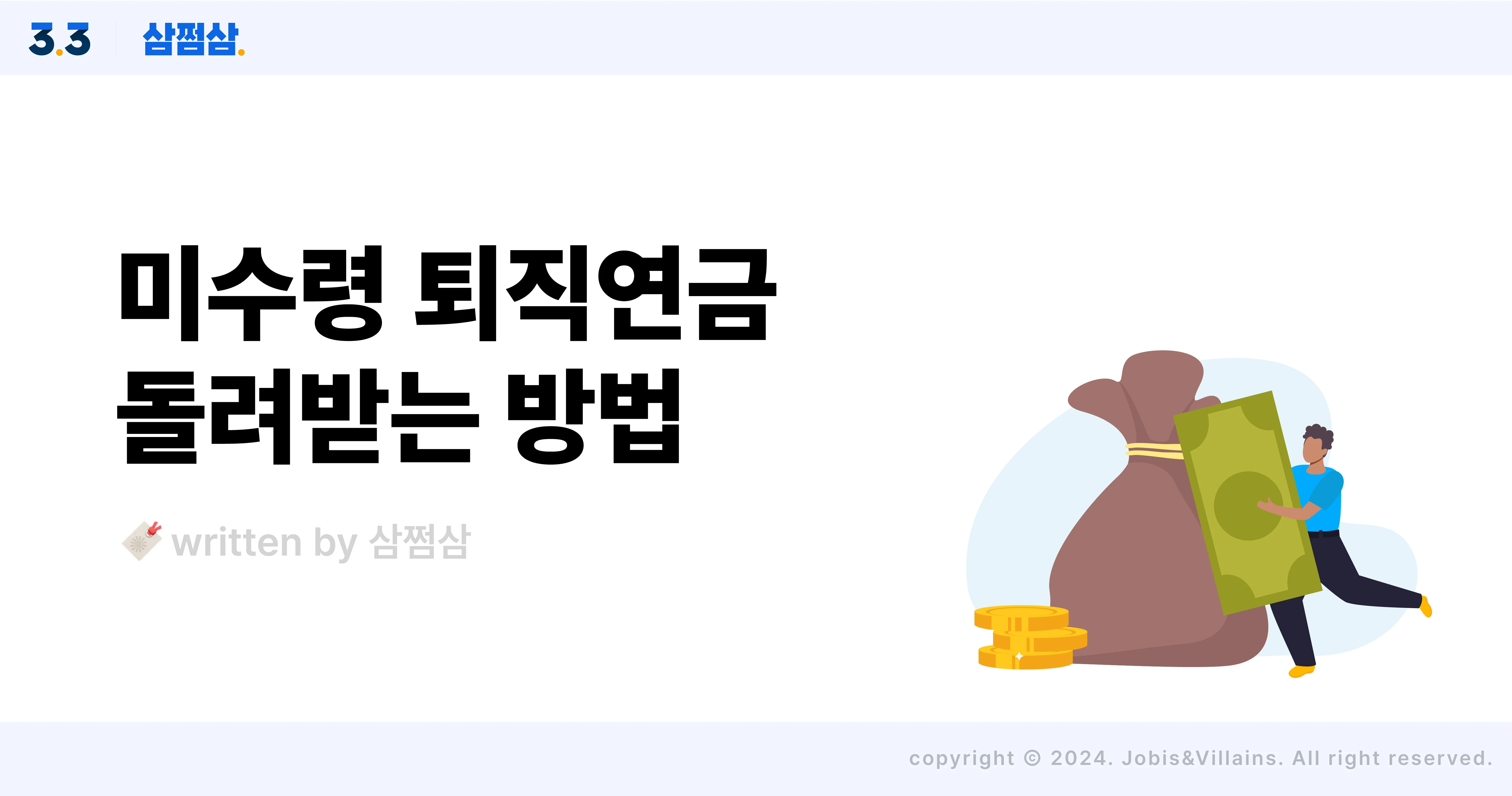 나 몰래 잠자던 미수령 퇴직연금 조회하는 방법(ft. 통합연금포털) 미수령 퇴직연금 조회 및 수령 방법 잠자던 휴면계좌 잔고부터 포인트, 보험금까지. 나도 모르게 잠자던 돈이 이렇게나 많았다고? 싶었는데, 여기에 하나 더 추가됐어요. 바로 미수령 퇴직연금! 근로자가 찾아가지 않은 퇴직연금이 무려 1천 100억 원이라고 해요. ‘혹시 내 퇴직연금도 있을까?’ 여러분도 한 번 조회해 보세요! 왜 예전엔 못 받은 건데? 퇴직연금제도란 재직 중인 근로자의 퇴직 급여를 외부 금융기관에 적립해 근로자가 퇴직한 후 금융기관으로부터 연금 또는 일시금 형태로 지급받도록 한 제도인데요. 이러한 제도를 도입하게 된 배경에는 크게 두 가지 이유가 있어요. 첫 번째는 근로자의 잦은 이직이나 중간 정산 등으로 은퇴 이전에 퇴직금을 생활자금으로 소진해 노후 소득 보장이 어려워짐을 해결하기 위한 목적이고요. 두 번째는 사업주가 퇴직금을 장부상으로만 기재해 직장이 도산·폐업했을 때 퇴직금이 체불되는 문제를 개선하기 위해서였어요. 그런데 문제는 근로자가 퇴직연금 가입 사실을 알지 못한 상황에서 직장이 도산·폐업해 퇴직연금이 있는지도 몰랐다거나, 어디에 청구할지 몰라서 못 받은 사람이 꽤 많았다는 거예요. 아니면, 퇴직 후에 퇴직연금 신청 방법을 몰라 신청하지 못하는 사람들도 있었고요. 이러한 이유로 찾아가지 않은 퇴직연금의 적립금 규모가 2023년 말 기준 1,106억 원, 최근 3년 간 평균 1,177억 원에 달한다고 해요. 이에 정부에서는 가입자가 퇴직연금 적립금을 조회 및 확인할 수 있는 서비스를 마련해두고, 미청구 퇴직연금 적립금을 쉽게 되찾아갈 수 있게 만들었답니다. 현재 내 퇴직연금 얼마나 적립됐지? 현재까지 적립된 내 퇴직연금 적립금은 금융감독원 홈페이지 ‘통합연금포털’에서 조회해 볼 수 있어요. 👉🏻 통합연금포털 바로가기 통합연금포털 > 내연금조회 서비스를 이용하면 되는데요. 현재 자신의 적립금이 관리되고 있는 금융회사명과 연금 상품명, 적립금액이 조회가 가능하답니다. 단, 회원가입 후에 최초 조회하면 바로 조회는 불가능하고, 3일 정도가 소요돼요. 이 서비스를 이용하면 직장 폐업 등으로 퇴직연금을 못 받았을 때의 미청구 적립금 정보를 확인할 수 있답니다. 그 후 확인된 금융회사로 연락해 연금 수령을 신청하면, 무사히 퇴직 연금을 받아보실 수 있어요. 앞으로는 모바일앱으로도 미청구 퇴직연금 수령 가능해요 한편, 앞으로는 금융회사에서 자체적으로 폐업 기업 근로자가 자사 홈페이지나 앱에 접속하면 팝업 메시지 등을 통해 미청구 퇴직연금 보유 사실과 수령 절차를 맞춤형으로 안내할 예정이라고 해요. 이와 더불어 퇴직연금 수령도 굳이 금융회사를 찾아가지 않고 비대면으로 진행할 수 있도록 서비스가 개선될 예정이라고 하니, 수령 절차가 훨씬 간편해지겠죠? 이외에도 금융결제원 모바일 앱 <어카운트인포>에서 미청구 퇴직연금 조회를 하고, 수령 방법을 안내하는 시스템을 올해 상반기 중으로 구축할 예정이라고 하니, 앞으로는 몰라서 퇴직연금 못 받는 일은 없을 거예요. 오늘은 몰라서, 복잡해서 놓치고 있었던 미수령 퇴직연금 조회 방법을 알아봤어요. 우리 생활 곳곳에는 우리 몰래 잠들어 있는 돈들이 꽤 많아요. 그중 하나가 바로 휴면 환급금인데요. 혹시 나도?라는 생각이 드신다면 삼쩜삼 앱에 접속해 여러분의 휴면 환급금도 함께 찾아보시기 바라요! - 해당 콘텐츠는 2023. 03. 19 기준으로 작성되었습니다. - 해당 콘텐츠의 내용은 일반적인 정보를 참고 목적으로만 제공하고 있으며, 개개인의 상황에 따라 달리 적용될 수 있습니다. 따라서 콘텐츠를 통해 취득한 일반적인 정보로 인한 직간접적 손해에 대해서 당사는 법적 책임을 지지 않음을 알려드립니다. ⓒ자비스앤빌런즈, 무단 전제 및 배포 금지 미수령_퇴직연금_조회_수령_방법_통합연금포털_직사각.webp100 킬로바이트 미수령_퇴직연금_조회_수령_방법_통합연금포털2.webp100 킬로바이트 미수령_퇴직연금_조회_수령_방법_통합연금포털.webp100 킬로바이트 미수령_퇴직연금_조회_수령_방법_통합연금포털3.webp100 킬로바이트 도움이 되었습니까? 예 아니요 0명 중 0명이 도움이 되었다고 했습니다. 어떤 부분이 아쉬웠나요? 도움말에 대한 피드백을 남겨주세요.