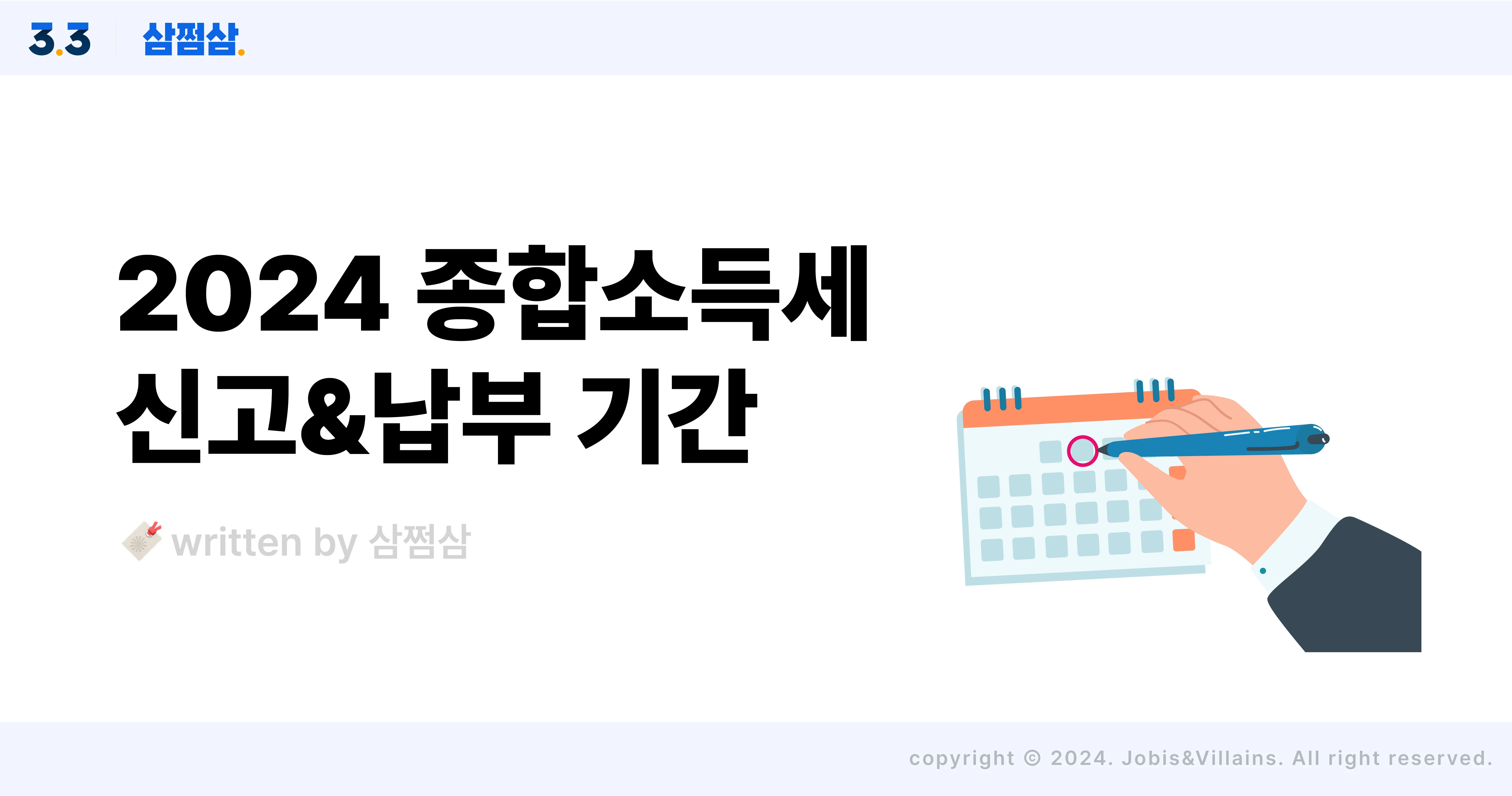 2024 종합소득세 신고 기간& 납부 방법 핵심 요약집 2024 종합소득세 신고&납부 요약집 5월=종합소득세 신고 기간. 사장님이나 프리랜서라면 이 공식 하나쯤은 알고 있겠죠? 하지만 본업에 치여 기한을 잊고 있다가 뒤늦게 부랴부랴 신고하는 경우도 많아요. 자칫 기한이라도 넘겨버리면 가산세 폭탄을 맞을 수도 있고요. 물론, 절세는 물 건너간 셈이죠. 오늘은 2024 종합소득세 신고 기간 및 납부에 대해 알려드릴 텐데요. 이 글을 꼭 저장해두고 기한 놓치는 일 없도록 해요! 휴대폰 알람 설정도 잊지 마시고요! 5월 31일(금)까지 종합소득세 신고 기간 및 납부 기간입니다 종합소득세란 지난해 1년간벌어들인 수입에 대해 납부하는 세금이에요. 이때 과세 대상 소득에는 근로소득, 이자소득, 배당소득, 사업소득(임대소득), 연금소득이 있죠. 매년 그렇듯이 올해 역시 종합소득세 신고 기간 및 납부 기간은 5월 한 달로, 마감일은 5월 31일(금)이랍니다. (*성실신고확인서 제출자는 5월 1일부터 6월 말까지) 그런데 세금 신고∙납부 기간은 코리안 타임처럼 느긋하게 생각할 일이 아니에요. 만일 이 기한을 지키지 못하면, 페널티를 받게 되거든요. ① 세 부담이 커져요 5/31일까지 종합소득세 신고 및 납부하지 않으면, 국세청에서는 추계의 방법으로 소득 금액을 계산해요. 이때는 장부를 기장해 종소세 신고를 하는 금액에 비해 일반적으로 세금이 많이 나와요. 또, 본인에 대한 소득공제와 표준 세액공제밖에 적용하지 않죠. 이렇게 되면 원래 받았어야 할 세액공제 및 감면을 못 받게 되니 세금 부담이 커질 수밖에 없어요. ② 건강보험료도 높게 책정돼요 건강보험료는 소득을 바탕으로 금액이 추징돼요. 그런데 제때 종합소득세를 신고하지 않아 국세청에서 정한 소득자료를 바탕으로 건강보험료가 다시 산정되면, 원래 내야 하는 보험료보다 더 많은 금액을 납부하게 될 수도 있답니다. ③ 필요할 때 돈 빌리기 힘들어요 은행에서 대출을 받거나 국가에서 진행하는 지원 사업을 신청할 때 반드시 요구하는 서류가 하나 있어요. 바로 ‘소득 금액증명원’. 근데 종합소득세 신고를 하지 않으면 이 서류가 발급되지 않아요. 소득을 가늠할 수 있는 기준이 없기 때문인데요. 서류를 낼 수 없으니 대출은 물론 지원금 신청도 못하게 되니 진짜 필요할 때 자금을 융통하기 쉽지 않을 거예요. ④ 가산세로 세금을 더 걷어가요 마지막 페널티는 가산세예요. 직접적으로 종합소득세 신고 의무를 다하지 않은 행위에 대한 벌금을 물리는 건데요. 그것도 한 가지가 아니라 두 가지의 가산세를 내야 해요. 바로 무신고 가산세와 납부 지연 가산세. 특히나 납부 지연 가산세는 세금 납부가 지연되는 일마다 가산세가 점점 늘어나는 구조라, 혹시 기한을 놓쳤더라도 하루빨리 납부해 불어나는 가산세를 줄여야 한답니다. 종류 부과 사유 가산세액 무신고 가산세 일반 무신고 무신고납부세액×20% 일반무신고(복식부기의무자) MAX[①, ②]① 무신고납부세액×20%② 수입금액×0.07% 부정무신고 무신고납부세액×40%(국제거래 수반시 60%) 부정무신고(복식부기의무자) MAX[①, ②]① 무신고납부세액×40%(국제거래 수반시 60%),② 수입금액×0.14% 납부지연 가산세 미납·미달납부 미납·미달납부세액×미납기간×0.022%※ 미납기간: 납부기한 다음날~자진납부일(납세고지일) 이런 페널티들을 생각한다면, 반드시 5/31일까지 종합소득세 신고 및 납부해 주세요. 만약 정말 깜빡 잊고 신고를 놓쳤다면 마지막 보루가 남아있긴 해요. 바로 기한 후 신고! 한 달 안에 기한 후 신고하면 가산세 50% 감면받아요 불행 중 다행인 건, 5/31일까지 종합소득세 정기 신고 기간에 신고 및 납부하지 않은 분들은 6/3일(월)부터 기한 후 신고가 열린다는 사실. 6월 중으로 빠르게 신고하면 가산세를 50% 감면받을 수 있어요. 신고기한 경과 가산세 감면율 1개월 이내 신고 및 납부 50% 1개월 초과 3개월 이내 신고 및 납부 30% 3개월 초과 6개월 이내 신고 및 납부 20% 위 표를 보면 아시겠지만, 기한 후 신고는 빠를수록 좋으니 적어도 6월 말일까지는 꼭 해결해야겠죠? Q. 기한 후 신고도 놓쳤다면 어떻게 하나요? A. 이때는 관할 세무서장이 세금을 일방적으로 정해 납부 고지서를 보내와요. 앞서 살짝 언급 드렸는데요. 국세청에선 추계 방식으로 내 소득을 결정하기 때문에 기장 방식보다 더 많은 소득이 산정되죠. 또, 가장 기본적인 공제만 적용되어 세액이 결정되므로 실제 부담했어야 할 세금보다 훨씬 많은 금액을 세금으로 내야 해요. 여기에 가산세도 붙을 만큼 붙기 때문에 분명 여러분이 예상한 것보다 그 이상의 세액을 내야 할 거예요. 혹시 미납 납부세액이 크다면, 가산세는 미납 납부세액에 비례해 붙기 때문에 최종 세액이 눈덩이처럼 불어나겠죠. 더욱이 기한 후 신고는 관할 세무서의 담당 조사관이 정기 신고보다 더 엄격하게 신고내용을 검토하기 때문에 종합소득세 신고 및 증빙 서류 준비에도 만전을 기해야 하죠. 그래서 결론은 무조건! 5월 1일부터 5월 31일까지인 종합소득세 정기 신고 기간을 놓치지 말라는 것! 그렇다면 알아두어야 할 종합소득세 신고&납부 방법 1) 종합소득세 