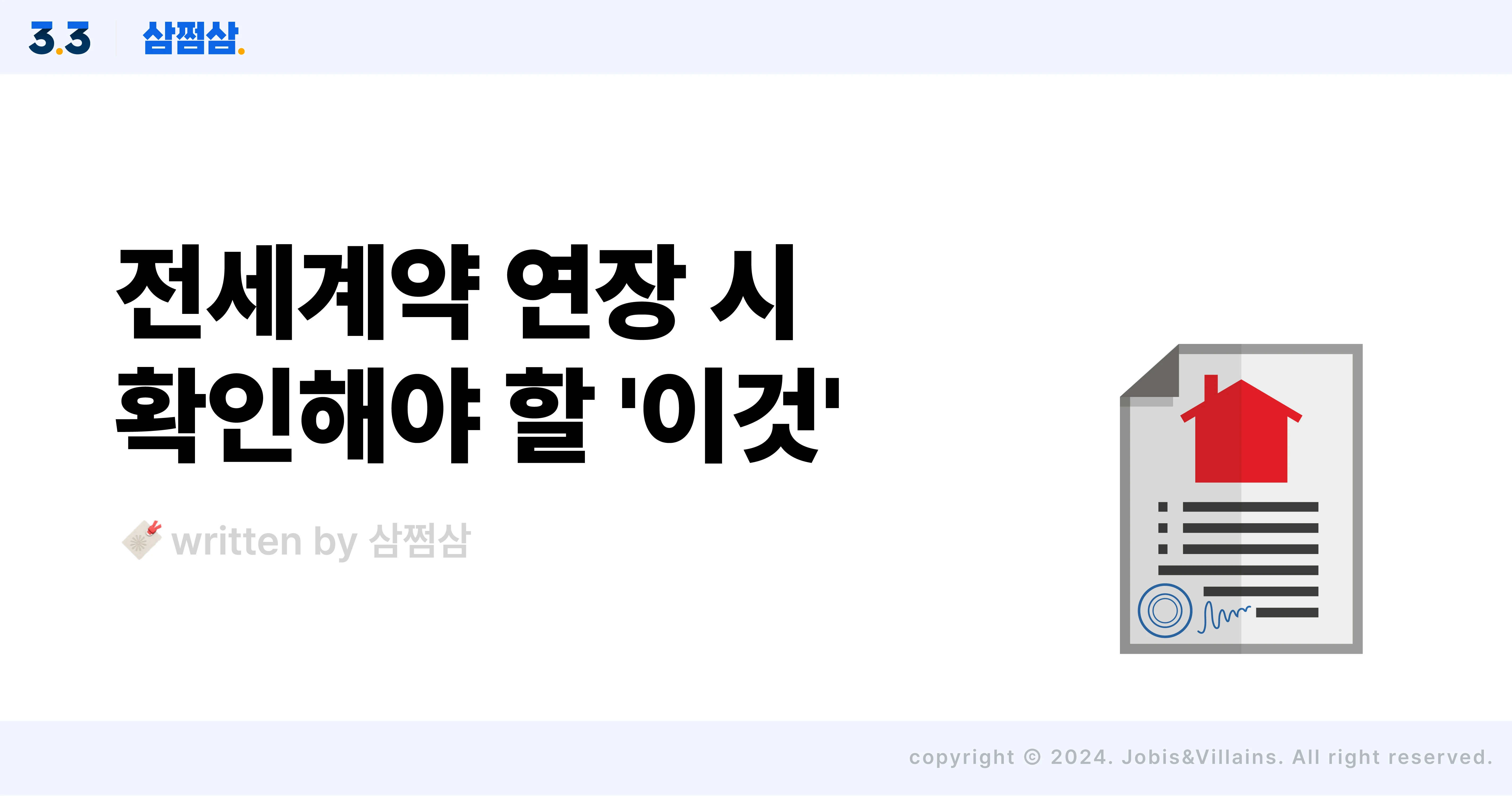 전세계약 연장 감액/증액 시 계약서 꼭 써야 할까?(ft. 확정일자) 전세계약 연장 체크리스트 전세사기로 떠들썩한 요즘, 지금 전세에 살고 있다면 섣불리 다른 전세를 구해 나가기도 불안할 텐데요. 그래서 전세계약 기간을 연장하고 싶은데.. ‘집주인에게 언제 연락을 해서 계약 연장 의사를 밝히면 되는지’, 전세계약 연장 시에도 계약서를 다시 작성해야 하는지‘, ’현 시세보다 전셋값이 많이 떨어졌는데, 이 부분을 다시 반영할 수 있는 건지‘ 등 궁금한 게 많을 거예요. 그래서 오늘은 전세계약 기간 연장할 때, 눈여겨보아야 할 것들을 정리해 봤어요. 전세계약 연장하고 싶다면, 집주인에게 미리 말해두세요! 집주인과 세입자는 임대차 만료 기간 즈음에 당사자 간 합의로 계약을 갱신할 수 있어요. 이때 임대차계약의 조건을 변경하거나, 그 기간을 변경하는 등 세부사항을 합의할 수 있죠. 아니면 기존 계약과 같은 조건으로 합의할 수도 있고요. 그런데 묵시적 갱신이라는 말 들어보셨나요? 계약 만료가 끝나기 6개월 전부터 2개월 전까지 집주인이 계약 연장 거절 의사를 밝히지 않거나, 세입자가 계약 연장 통지를 하지 않으면 기존 계약과 같은 조건으로 다시 임대차한 걸로 본다는 의미인데요. 단, 당사자 둘 중 하나가 갱신거절이나 계약조건 변경 통지를 했을 경우에는 묵시적으로 갱신되지 않아요. 반대로, 묵시적 갱신이 되었다면 이미 같은 조건으로 자동 연장이 된 셈이라 갑자기 계약조건을 바꿀 수도 없고요. 즉, 계약을 연장할 의사가 있다면 계약 기간이 만료되기 최소 2개월 전에는 전세계약 연장 의사를 밝혀 두어야 한답니다. 집주인이 계약 갱신 거절? 이럴 때만 가능해요 ⭕️ 세입자가 임대차계약 연장 의사를 밝혔다면, 집주인은 정당한 사유 없이 이를 거절할 수 없어요. 전세계약 기간 2년이 끝난 후 2년을 더 연장할 수 있다는 주택임대차보호법 조항에 따른 건데요. 하지만 정당한 사유가 있다면 집주인이 전세계약 갱신을 거절할 수도 있답니다. <전세계약 연장 거절 사유 9가지> 1. 세입자가 2기의 차임액(월세액)을 연체한 사실이 있는 경우 2. 세입자가 거짓이나 그 밖의 부정한 방법으로 임차한 경우 3. 서로 합의하여 집주인이 세입자에게 상당한 보상을 제공한 경우 4. 세입자가 집주인 동의 없이 해당 주택을 전대해 타인이 사용하게 한 경우 5. 세입자가 임차한 주택의 전부 또는 일부를 고의나 중대한 과실로 파손한 경우 6. 임차한 주택의 전부 또는 일부가 멸실되어 임대차의 목적을 달성하지 못할 경우 7. 다음의 사유로 해당 주택의 전부 또는 대부분을 철거하거나 재건축해야 하는 경우 - 임대차계약 체결 당시 공사 시기 및 소요 기간 등을 포함한 철거 또는 재건축 계획을 세입자에게 구체적으로 고지했고, 사전 안내한 계획에 따라 공사를 진행하려는 경우 - 건물이 노후·훼손 또는 일부 멸실되는 등 안전사고의 우려가 있는 경우 - 다른 법령에 따라 철거 또는 재건축이 이루어지는 경우 8. 집주인이나 집주인의 직계존속, 직계비속이 해당 주택에 실제 거주하려는 경우 - 위 사유로 계약을 거절하였으나, 제3자에게 해당 주택을 임대한 경우나 2년간 실거주를 하지 않은 경우엔 세입자는 손해배상을 청구할 수 있어요. 9. 그 밖에 세입자로서 의무를 현저히 위반하거나 임대차를 계속하기 어려운 중대한 사유가 있는 경우 전세계약 연장 계약서도 다시 써야 할까? 만약 집주인과 이야기가 잘 돼 전세계약을 연장하기로 결정했다면 전세계약 연장 계약서를 다시 써야 할지도 궁금하실 텐데요. 이때는 재계약 시 전세금액에 변경이 있는지에 따라 계약서 재작성 여부가 달라져요. 일단 일전에 계약한 조건과 똑같은 조건으로 계약을 연장할 때는 계약서를 꼭 다시 쓸 필요는 없어요. 처음 계약 시 받았던 *확정일자의 효력을 유지하는 게 유리하므로 새로운 계약서를 작성하지 않는 경우가 많아요. *확정일자란? 임차주택 관할 주민센터 등에서 해당 날짜에 임대차 계약서가 존재한다는 사실을 공식적으로 확인한 일자. 우선변제권을 확보함으로써 보증금을 보호 받을 수 있어요. 그런데 최근에는 전세가가 하락해 계약조건인 전세금을 감액해서 전세계약 연장 감액을 하는 경우도 있는데요. 이때 역시 종전 임대차 계약서에 받아둔 확정일자가 유효하기 때문에 새롭게 전세계약 연장 계약서를 쓸 필요는 없어요. 다만 변경된 사항은 표시해 주는 게 좋죠. 통상 기존 계약서에 연장된 기간과 전세계약 연장 감액된 보증금을 새로이 기재하고 쌍방 확인 후 날인해 마칩니다. 그런데 이때, 문제가 되는 경우는 전세계약 연장 증액을 할 때인데요. 이때는 먼저 등기부등본을 다시 떼본 후 계약 기간에 권리 변동 등을 확인해야 해요. 그 사이 집 담보 대출금 등 근저당이 늘어나 위험부담이 가중될 수 있기 때문이에요. 🚨 등기부등본 근저당 설정 확인 후 깨알 Tip.처음 계약 시 없었던 근저당이 생긴 경우, 해당 건물의 시세와 내 보증금(전세계약 연장 증액분 포함), 새로운 근저당 금액 등을 잘 따져서 안전한지 체크해야 해요. 또한, 집주인에게 근저당권 말소를 요청해 특약사항으로 '선순위 근