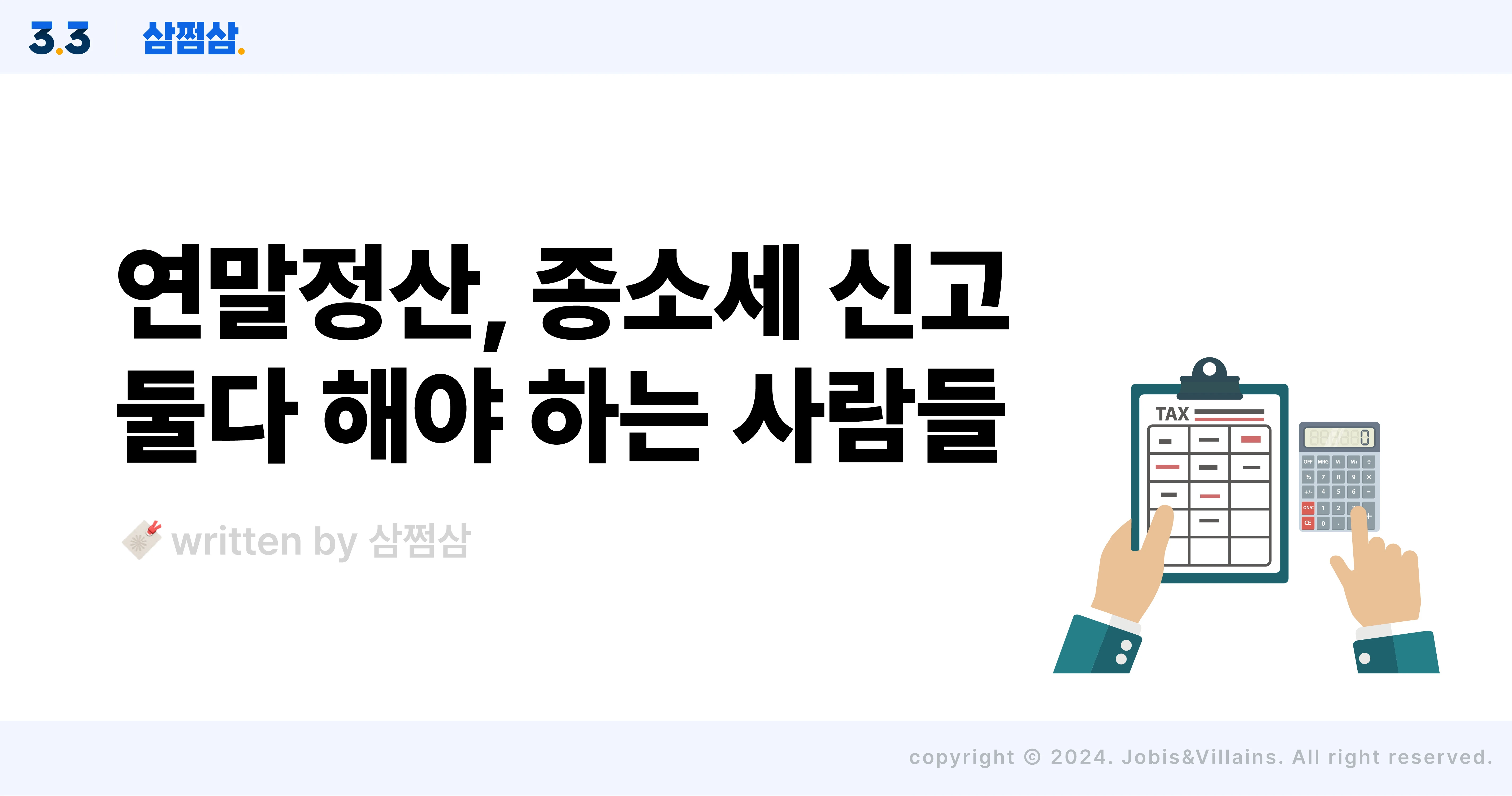 직장인 종합소득세 신고, 연말정산 후에 또 해야 하는 이유 직장인 종합소득세 신고 대상(소득별, 상황별) ‘직장인은 연말정산 하나로 세금 정산 끝난 거 아니었어요?’ 직장인은 연말정산하면 세금 신경 쓰지 않아도 된다고 생각하는 분들이 대부분이에요. 하지만 근로소득 외 다른 소득이 발생했다면? 연말정산때 챙기지 못한 공제가 있다면? 연말정산만으론 최종 세금 정산이 이뤄지지 않았을 수도 있어요. 이때는 직장인 종합소득세 신고를 해야 한답니다. 오늘은 근로소득 외 다른 소득을 발생시키고 있는 직장인 종합소득세 신고 유무를 정리해 보도록 할게요. case1. 근로소득 + 사업소득 아마 투잡 뛰는 직장인 유형이 가장 흔한 형태일 거예요. 직장에 다님과 동시에 별도의 자기 사업체를 운영한다던가, 아니면 프리랜서로 활동하시는 분들이죠. 이분들이 벌어들이는 수익이 바로 사업소득이거든요. 사업소득은 무조건 종합소득세 신고가 원칙이에요. 사업소득으로 3.3% 떼고 받은 급여가 있다면, 반드시 근로소득과 사업소득을 합산한 직장인 연말정산 후 종합소득세 신고를 해야 해요. 단, 사업소득이라 하더라도 직전 과세기간의 수입 금액이 7,500만 원 미만이며, 다른 소득이 없는 보험 모집인, 방문 판매원의 경우, 소속회사에서 연말정산했다면 종합소득세 신고하지 않아도 돼요. case2. 근로소득 + 기타소득 단발적인 강의나 원고료, 상금이나 사례금 등으로 일시적인 소득이 발생할 수도 있어요. 여기서 '일시적 소득'이 바로 기타소득에 포함되는데요. 수입 금액에서 필요경비를 제외한 기타소득 금액이 300만 원을 초과한다면 반드시 근로소득과 합산해 종합소득세 신고를 해줘야 해요. 단, 300만 원 이하라면 합산하지 않고, 기타소득만 분리과세로 종합소득세 신고를 해줄 수도 있는데요. 합산해서 신고하는 게 유리할지, 분리해서 신고하는 게 유리할지는 근로소득이 얼마나 되는지에 따라 달라져요. 기타소득 원천징수세율은 20%, 종합소득세율은 6~42%이므로 자신의 종합소득과세표준 세율 구간이 원천징수세율인 20%보다 낮은 구간이라면, 종합과세가 유리하다고 할 수 있어요. 하지만, 어떤 방법이 유리한 건지 선택하는 게 어렵다면 삼쩜삼에 맡겨보세요. 기타소득을 알아서 합산해 주고 어떤 방식으로 신고해야 더 좋은지 판단해 주거든요. 그럼 훨씬 더 유리한 방식으로 기타소득을 신고할 수 있답니다. <종합소득세 세율> 과세표준 세율 1,400만 원 이하 6% 1,400만 원 초과~5,000만 원 이하 15% 5,000만 원 초과~8,800만 원 이하 24% 8,800만 원 초과~1억 5천만 원 이하 35% 1억 5천만 원 초과~3억 원 이하 38% 3억 원 초과~5억 원 이하 40% 5억 원 초과~10억 원 이하 42% 10억 원 초과 45% case3. 근로소득 + 이자나 배당소득 상가 임대를 통해 임대료를 받거나 주식 배당으로 1년에 2,000만 원 넘는 금융 소득을 올리는 직장인이라면 근로소득과 이자, 배당소득을 합산해 직장인 연말정산 후 종합소득세 신고를 해줘야 해요. 단, 2,000만 원을 넘지 않을 경우에는, 분리과세 세율 14%를 적용해 분리해 신고할 수도 있는데요. 이때 역시 기타소득과 마찬가지로, 자신의 종합소득과세표준 세율 구간을 따져본 후에 분리 vs 합산 신고 여부를 선택하셔야겠죠? case4. 이직 작년에 이직에 성공해 두 군데의 직장 소득이 발생했다면, 이때는 전 직장에서의 소득 내역이 담긴 원천징수영수증을 현 직장에 제출해야 해요. 그럼 연말정산 담당자가 전 직장 소득까지 합산해 신고를 해주기 때문에 연말정산으로 납세의무는 종결되죠. 그런데 간혹 안 좋은 사유로 퇴사해 전 직장에 연락하기 꺼려지거나, 전 직장 소득 자료를 현 직장에 제출하기 부담스러운 경우도 있을 수 있어요. 그래서 현 직장에서의 소득만 가지고 연말정산한 분들이라면, 이전 직장의 근로소득 원천징수영수증을 발급해 5월 직장인 종소세 신고를 해주셔야 해요. case5. 퇴사 퇴사 시점에는 회사에서 기본적인 것만 공제해 연말정산 신고를 해줘요. 그래서 의료비나, 신용카드 공제액 등의 공제는 적용되지 않은 상태죠. 이 부분은 종합소득세 신고를 통해 퇴직 정산할 때 받지 못했던 공제를 포함해 신고해 줘야 해요. 이때는 이직자와 마찬가지로 근로소득 원천징수영수증을 준비한 다음 신고해 주면 되는데요. 타 소득이 없다면, 과다 납부한 세금을 환급받을 가능성이 꽤 커요! case6. 연말정산 오류 이런 경우도 있어요. 연말정산 하긴 했는데, 공제받았어야 할 항목을 나중에 알게 된 경우요. 예를 들어 공제받았어야 할 의료비가 있는데 공제받지 못했다거나, 부모님이 기본공제 대상자임에도 적용받지 못했을 때 등이죠. 이때는 공제 증빙자료와 정정 사유를 첨부해 종합소득세 신고하면 연말정산 오류를 바로잡고, 세금을 환급받을 수 있어요. 그러니 종합소득세 신고 기간 놓치지 말고 꼭 신고해 주세요. case7. 두 개 이상 직장에서 근무하는 경우 두 곳에서 근로소득자로 일하는 직장인분들 있으시죠? 이때는 주된 근무지를 하나 선택해 그곳에서 합산해 연말정산을 마쳤어야 해요. 근데, 이렇게 연말정산하려면 주된 근무지 외의 소득 정보를 연말정산 담당자에게 제출해야 하거