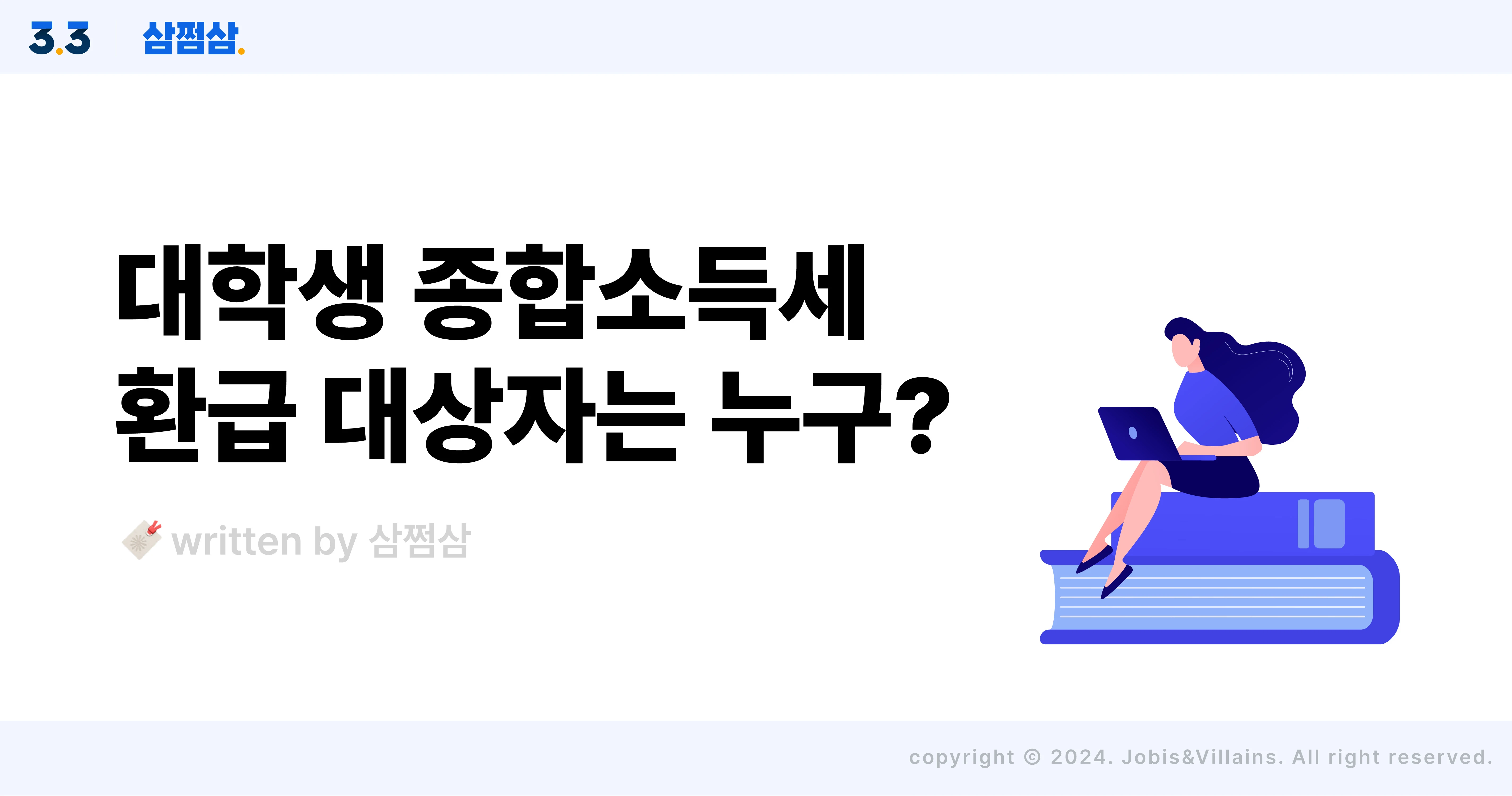 대학생도 종합소득세 신고하면 환급받는 경우 3가지 대학생 종합소득세 신고&환급 대상 소득 대학생이라면, 아직 본격적으로 경제활동을 하지 않는 경우가 대부분이기 때문에 대학생 세금 신고는 아예 생각조차 하지 않아요. 하지만 아르바이트를 통해 벌어들인 소득, 혹은 공모전 수상으로 받은 상금에 대해 원천징수된 세금이 있다면? 모르셨겠지만, 대학생 종합소득세 신고로 환급금을 받을 수도 있다는 사실! 왜 환급을 해준다는 건지 도통 이해가 안 간다면 이 글을 잘 읽어 보세요. "어? 이거 난데?"라는 생각이 드신다면 올해 종소세 신고 꼭 하셔야 합니다. 01. 3.3% 세금 떼고 알바비 받은 대학생, 환급 가능 ⭕️ 비싼 등록금과 생활비 부담에 학교를 다니면서 아르바이트를 병행하는 대학생들이 많은데요. 이때 아르바이트로 받은 급여에도 세금이 부과된다는 사실, 알고 계셨나요? 아르바이트 소득은 본래 원천징수 대상 사업소득에 해당해요. 그래서 일반적으로 아르바이트생을 고용한 사업주는 알바생에게 급여를 지급하기 전, 3.3%를 원천징수해 국세청에 납부한 후 차액을 지급한답니다. 즉 대학생 알바생은 알바비로 벌어들인 소득에 대해 세금을 계속 납부해온 셈이에요. 그래서 종합소득세 신고 결과, 알바비받을 때 떼인 세금(원천징수 세액, 기납부세액)보다 산출된 세액(총 결정세액)이 적다면 차액을 환급받을 수 있는 거랍니다. ※대학생 알바비 환급 공식 : 총 결정세액(내야 할 세금) < 기납부세액(이미 낸 세금) 단, 알바생 모두가 환급대상자에 해당하는 건 아니에요. 고용주가 세금을 원천징수해 별도로 납부했거나, 알바생을 일용직 근로자로 신고했다면 세금이 공제되지 않은 채 급여가 지급되거든요. 이때는 낸 세금이 없으니, 당연히 돌려받을 세금도 없겠죠? 따라서 이럴 경우에는 종합소득세 신고하지 않아도 괜찮아요. Q. 일용직 근로자 기준은? 근로 기간이 3개월 미만으로, 근로를 제공한 날 또는 시간의 근로 성과에 따라 받은 급여는 일용직 근로소득이라고 해요. 일용직 근로소득은 원천징수(세율 6% 단일세율) 만으로 과세가 종결되기 때문에 종합소득세 신고를 하지 않아요. 참고로 일용직 근로자의 경우 일 총 급여액이 187,000원을 넘지 않는다면 원천징수 세액조차 없어요. 즉, 소득세를 부과하지 않으니 당연히 종합소득세 신고하지 않아도 돼요. 02. 4.4% 세금 떼고 공모전 상금 받은 대학생, 환급 가능 ⭕️ 우선, 각종 공모전에서 입상해 받은 상금은 기타소득에 해당해요. 기타소득은 어쩌다 한 번씩 생기는 소득을 말하는데요. 이때 역시 제세 공과금이라고 해서 상금의 일정 부분이 원천징수돼요. 원천징수세율은 기타 소득세 20%에 지방 소득세 2%를 더한 22%로, 상금의 80%는 필요경비로 인정돼요. 쉽게 말해, 상금으로 100만 원을 받았다면 80만 원은 필요경비로 인정받고, 나머지 20%인 20만 원에 대해 원천징수 세율 22%를 적용하는 거죠. 즉, 100만 원에서 4만 4천 원을 세금을 떼이는 것이니 결과적으로 상금의 4.4%가 과세되는 셈이죠. 이렇게 떼인 세금 역시, 종합소득세 신고 시 총 결정세액과의 차이만큼 환급받을 수 있어요. 💡공모전 상금, 이것도 알아두세요! ✅기업이 아닌 국가기관이나 지자체가 주최한 공모전 상금에는 세금이 붙지 않아요. ✅또, 상금이 25만 원 이하인 경우 역시 세금이 부과되지 않죠. 이때는 낸 세금이 없으니, 종합소득세 신고로 환급받을 세금 역시 없는 셈. 따라서, 종합소득세 신고하지 않아도 돼요. 03. 8.8% 세금 떼고 받은 연구비, 환급 가능 ⭕️ 대학교 학사과정 또는 대학원 석·박사 과정에 있는 학생 중 연구개발 과제에 참여하는 학생이라면 인건비 명목으로 연구비를 받게 되는데요. 이러한 연구비는 기타소득으로서, 필요경비가 60%만 인정돼요. 앞서 살펴본 것처럼, 기타 소득세 원천징수세율은 22%(기타 소득세 20% + 지방 소득세 2%)인데요. 즉, 필요경비를 제외한 40%에 대해 22%의 세율을 적용해, 연구비의 8.8%가 원천징수된다고 할 수 있어요. 만일 연구비로 100만 원을 받았다면, 필요경비를 제외한 40만 원에 대해 22%의 세율을 적용해 8만 8천 원이 과세되는 셈이죠. 그리고 이렇게 연구비에서 원천징수된 세금에 대해서도 5월 종소세 신고를 통해 대학생 세금 정산을 하게 되는데요. 벌어들인 소득에 따른 결정세액과 원천징수된 세액을 비교해 이미 낸 세금이 많다면 환급받을 수 있어요. 삼쩜삼에서 대학생 종합소득세 신고하고 최대 환급금 받아 가세요! 매년 세금 신고하는 직장인, 사업자도 어려운 세금. 아직 본격적으로 돈을 버는 게 아닌 대학생들에겐 더 어렵고 낯설 거예요. 이럴 때 찾는 건 어디? 바로 삼쩜삼입니다. 대학생들이 버는 소득 중 많은 비중을 차지하는 기타소득, 알바 사업소득 등은 수입이 불규칙해 자칫하면 놓칠 수 있는 부분들이 많아요. 하지만 삼쩜삼은 여러분의 작은 소득 하나조차 놓치지 않고 꼼꼼히 찾아준답니다. 특히 지난해 외에도 알바 등 소득이 있었다면 해마다 검색해 찾을 필요 없이 자동으로 합산해 주고요. 삼쩜삼 대학생 종소세 신고 절차 역시 정말 간단해요. 삼쩜삼 앱 접속 카카오톡 로그인 및 간편 인증 소득 및 