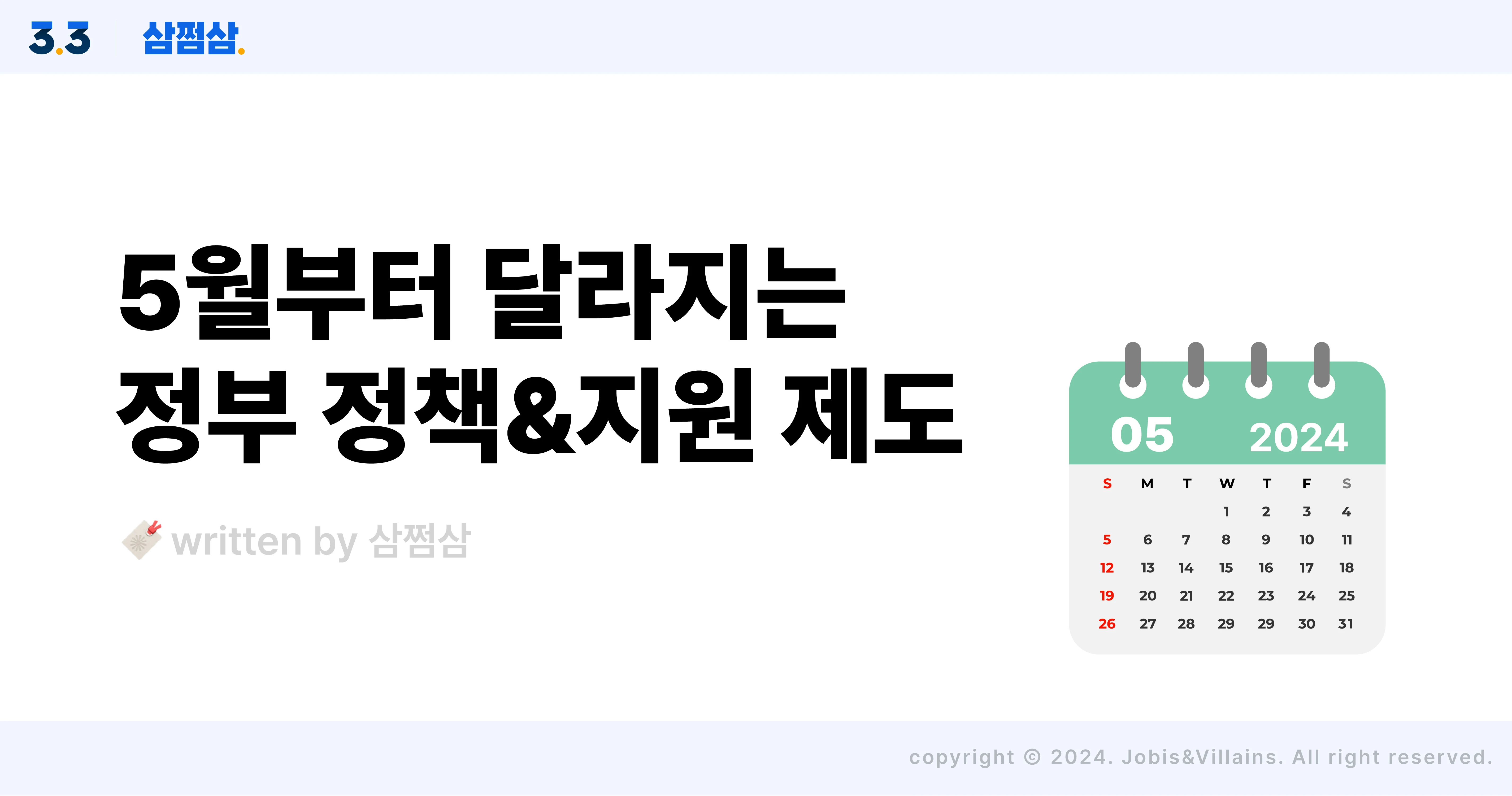 청년내일저축계좌, 근로장려금 신청 시작! 5월부터 달라지는 정부 정책&지원 제도 5월 정부 정책&지원 제도 종합소득세 환급액을 기대해 볼 수 있는 5월. 이번 달은 어떤 정부 정책으로 더 많은 혜택을 받아볼 수 있을지 궁금하시죠? 바로 알아볼게요! 대중교통 탈수록 이득! 최대 53% 할인받는 K-패스 카드 출시 5.1~ 기존 알뜰 교통카드를 이용하고 계시던 분이라면 4월 30일부로 종료된 카드 혜택을 받지 못해 무척 아쉬울 거예요. 하지만 이번 달부터는 더 좋은 혜택을 받아볼 수 있는 K-패스 교통카드로 전환할 수 있어요. 4월까지 알뜰 교통카드에 적립된 마일리지는 K-패스로 전환해 사용할 수 있으니 알뜰 교통카드 홈페이지에서 전환 신청해 주세요. 단, 알뜰 교통카드 홈페이지는 6월 30일까지 운영하며, 그 이후에는 마일리지 조회 및 회원 전환이 불가능하다는 점, 꼭 기억해 두세요. [K-패스 이용 혜택 및 조건] 월 15회 이상 대중교통 이용 금액 대상, 최대 월 60회 환급 (첫 달은 15회 미만도 인정) 대중교통 이용요금 20~53.3% 환급 적용 대상 환급 비율 비고 일반 20% *청년: 만 19~34세*저소득층: 기초생활수급자, 차상위계층 청년 30% 저소득 53.3% [적용 가능 대중교통 범위] 전국 시내버스, 마을버스, 지하철, 신분당선, 광역버스, GTX-A (단, 인구 10만 명 미만 일부 지역 제외) [발급 방법] 신규 발급: 10개 카드사 누리집 or 앱에서 발급 알뜰 교통카드 전환 발급: 6월 30일까지 알뜰 교통카드 누리집에서 회원 전환 (*신규 발급 가능 카드사: 신한, 하나, 우리, 현대, 삼성, BC, KB 국민, NH농협, DGB유페이, 이동의즐거움) [카드 종류별 환급 방식] 체크카드: 연결된 계좌로 환급 신용카드: 익월 결제 대금에서 자동차감 선불형 충전식 카드: 카드사 앱에서 적립금액 충전 최대 월 30만 원 지원! 청년내일저축계좌 신청 시작 5.1~5.21 일하는 저소득 청년들에게 목돈 마련의 기회를 제공하고자 출시된 청년내일저축계좌! 매월 10만 원씩 3년간 저축하면 720만 원~최대 1,440원의 목돈을 마련할 수 있답니다. 2022년 시작된 청년내일저축계좌는 벌써 누적 가입자 수가 9만 명에 달한다고 해요. 특히나, 올해에는 가입 기준과 절차를 간소화해 4만여 명을 추가 모집할 예정이라고 하니 서둘러 신청 접수하시기 바라요. ✅2024년 청년내일저축계좌 달라진 점 정리 4만여 명 추가 모집 기준 중위소득 충족 시 별도 가구 자산조사 없음 기존에는 군입대∙임신∙출산∙육아로 인한 휴직∙퇴직 시 적립 중지되었으나 본인 희망 시 지속 납입 납입일 자동 알림 서비스 신설 [신청 대상] 근로를 하고 있는 19~34세 청년, 15~39세 수급자, 차상위자 [가구소득 기준] 기준 중위소득 100% 이하 (1인 가구 월 223만 원, 2인 가구 월 368만 원, 3인 가구 월 471만 원) 근로소득 월 50만 원 초과~230만 원 이하 (수급자, 차상위 월 10만 원 이상) [지원금액] 일반: 3년간 월 10만 원 저축 시 월 10만 원 지원=총 월 20만 원 적금 수급자, 차상위자: 3년간 월 10만 원 저축 시 월 30만 원 지원=총 월 40만 원 적금 [만기금 수령] 총 수령액=본인 부담금 360만 원+지원금 360만 원~1,080만 원+이자 만기금 수령 조건: 근로 지속, 10시간 교육 이수, 자금 사용계획서 제출 [가입신청 기간] 5월 1일~5월 21일 (대상자는 8월 중 개별 안내 메시지 안내) [신청 방법] 오프라인: 관할 행정복지 센터 방문 온라인: 복지포털 사이트 복지로에서 신청 근로장려금, 자녀장려금 신청 시작 5.1~5.31 5월은 근로장려금과 자녀장려금 정기 신청을 하는 달입니다. 올해엔 특히 자녀장려금 신청대상과 지급액 폭이 크게 늘어났답니다. [지원 대상] 2023년 근로소득, 사업소득, 종교인 소득이 있는 사람 중 아래 요건 충족자 구분 2023년 부부합산 연간 총 소득 재산 기준 근로장려금 자녀장려금 단독가구 2,200만 원 7,000만 원 미만 가구원 전체 2억 4,000만 원 미만 홑벌이가구 3,200만 원 맞벌이가구 3,800만 원 [장려금 지급액] 위 조건에 부합한다면 근로장려금은 최대 330만 원, 자녀장려금은 자녀 1인당 최대 100만 원을 받아볼 수 있어요. 구분 근로장려금 지급액 자녀장려금 지급액 단독가구 최대 165만 원 1인당 최대 100만 원 (18세 미만 자녀, 최대 3명) 홑벌이가구 최대 285만 원 맞벌이가구 최대 330만 원 [신청방법] 모바일 안내문 '신청하기' 클릭 우편 안내문 QR코드 스캔 신청 ARS(☎️1544-1944) 전화 신청 60세 이상 고령자, 중증 장애인은 상담 센터(☎️1566-3636) 대리 신청 요청 가능 (신청 안내문을 받지 못했다면 홈택스 또는 앱으로 신청) 참고로 고령자, 중증 장애인 장려금 대리 신청의 경우 신청 기간에 1번 만 동의하면 향후 2년간은 자동으로 신청이 완료됩니다. 얼마전 삼쩜삼에서 근로장려금 관련 내용을 자세히 다룬 포스팅을 했는데요. 궁금하신 분들은 아래 링크에서 확인해 주세요. 🔗근로장려금 신청 조건&방법 자세히 보기 이제 병원 갈 때 신분증 지참 필수! 5.20~ 최근 대리처방에 관한 이슈가 불거지며 이러한 건강보험 도용 문제를 해결하기 위해 의료기관에서의 본인확인이 강화됩니다. 쉽게 말해 이제 병원에 갈 때 신분증을 꼭 가지고 가야 한다는 말인데요. 아마 요즘 병원에 가보신 분들은 들어보셨을 거예요. 지금은 신분증이 없어도 주