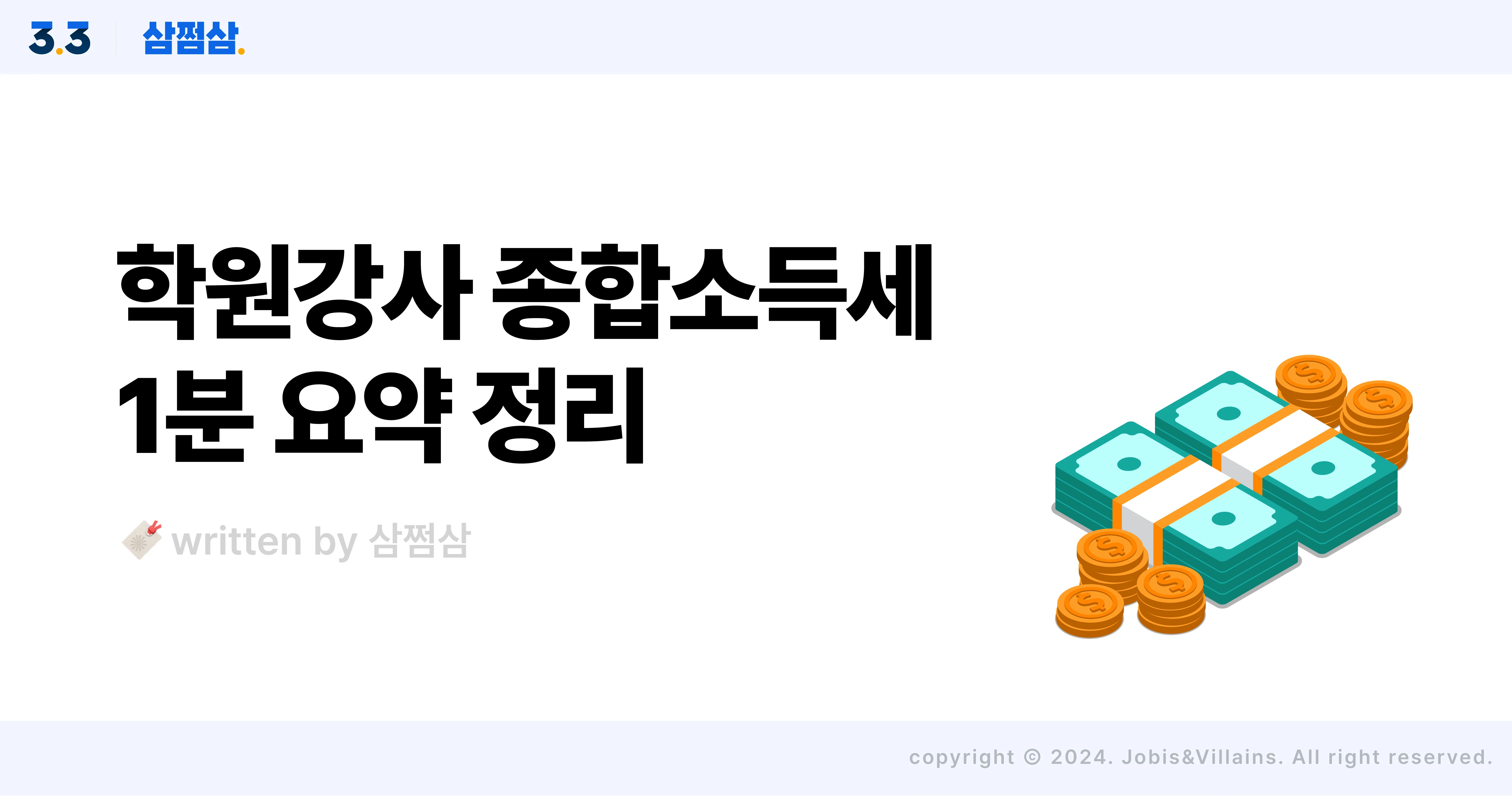 학원강사 종합소득세 신고 핵심 1분 정리 학원강사 종합소득세 신고 학원강사로 일하시는 분들 가운데 학원에 정규직으로 고용돼 일하시는 분들도 있을 테고, 아니면 프리랜서로 활동하시는 분도 계실 거예요. 정규직 학원강사라면 올해 초 연말정산을 통해 세금 정산을 하셨을 텐데요. 프리랜서로 활동하는 학원강사라면 5월 종합소득세 신고 기간에 세금 정산을 해야 한답니다. 오늘은 학원강사 중 종합소득세 신고를 해야 하는 경우를 알아보고 절세 팁까지 야무지게 파헤쳐 볼게요! 학원강사 종합소득세 신고 방법 프리랜서로 활동하는 학원강사는 학원에서 고용하는 형식이 아닌 '위촉'으로 채용하는데요. 이때는 강사를 사업자로 인식해, 3.3%의 사업 소득세를 원천징수하고 급여를 지급합니다. 이때, 원천징수 세액(미리 떼인 세금)이 실제 부담해야 할 세금보다 많은 경우에는 환급금이 발생하겠죠? 단, 그전에 알아둬야 할 게 있어요. 바로 학원강사 종합소득세 신고는 수입 금액에 따라 달라지고, 세무사에서도 각기 다른 유형의 신고 안내문을 발송한다는 사실이죠. 수입금액 구분 기장신고 추계신고 2,400만 원 미만 간편장부 단순경비율 2,400만 원 이상 7,500만 원 미만 간편장부 기준경비율 7,500만 원 이상 복식부기 x 위 표를 보면 알 수 있듯이 수입 금액에 따라 기장신고 방법과 추계 신고을 했을 때 경비율이 각각 달라요. 그런데 용어가 낯선 분들, 있으시죠? 아래 간단히 설명해 드릴게요. ✅ 간편장부 vs 복식부기 모든 사업자는 장부작성(기장) 의무가 있어요. 이 장부를 통해 수입과 경비를 파악하기 위함인데요. 소규모 사업자는 장부작성에 부담을 느끼는 경우가 많으니 국세청에서 가계부 쓰듯 쉽게 작성할 수 있도록 간편장부란 걸 만들었어요. 한편, 복식부기는 자산과 부채의 증감 및 변화하는 과정과 결과를 대변과 차변으로 구분해 기록해야 하는 장부예요. 복식부기는 일반 납세자가 작성하기 쉽지 않아, 전문가에게 맡기는 경우가 많아요. ✅ 추계신고 시 단순경비율 vs 기준경비율 장부작성 의무자임에도 장부를 작성하지 않았다면, 실제 소득을 파악하기 어렵죠. 그래서 나라에서 임의로 업종별로 경비율을 정해두었어요. 이 경비율에 따라 비용을 처리해 실질 소득을 추정해 계산하는 건데요. 이때 적용되는 경비율은 수입 금액에 따라 단순경비율과 기준경비율로 나뉩니다. 학원강사 단순경비율은 전체 매출에서 일정 비율만큼을 통으로 비용으로 인정하는 방식. 그리고 학원강사 기준경비율은 주요 경비는 제외하고 그 나머지 비용에 대해서만 경비율을 적용해 비용을 산정하는 방식이에요. 이제 수입 금액별로 종합소득세 신고하는 방법을 좀 더 자세히 설명해 드릴게요. (1) 수입 금액 2,400만 원 미만 작년 수입 금액이 2,400만 원 미만이라면 간편장부대상자 중에서도 단순경비율(61.7%) 추계신고가 가능한 분들이에요. 아무래도 세금 계산이 쉬우니, 아예 나라에서 세금 신고서까지 모두 채워 전달해 주는데요. 이걸 모두채움서비스라고 해요. 세액을 미리 계산해 안내해 주기 때문에, 여러분이 신고서를 확인한 후에 수정사항이 없다면 그대로 신고하시면 되죠. 단, 모두채움에 빠져있는 공제 항목이 있는지는 다시 한번 확인이 필요해요. 놓친 공제가 있다면 당연하게도 환급금은 줄어들 수밖에 없답니다. (2) 수입 금액 2,400만 원 이상 7,500만 원 미만 간편장부, 기준경비율 대상자에 해당해요. 복식부기보다 상대적으로 간편한 간편장부를 통해 작년도의 수입과 비용을 합산해 신고할 수 있는데요. 만일 장부를 작성하지 않았다면 기준경비율을 적용해 추계신고하게 돼요. 학원강사 단순경비율보다 훨씬 낮은 세율을 적용받아서요. 학원강사 기준경비율 추계신고 시에는 주요 경비를 적격증빙(세금계산서, 계산서, 현금영수증, 신용카드 매출전표)으로서 입증받아야 경비 처리가 돼요. 즉, 세금 더 내지 않으려면 적격증빙 수취를 꼼꼼하게 해 제출하는 게 중요하답니다. (3) 수입 금액 7,500만 원 이상 복식부기의무자로 안내문을 받아보셨을 텐데요. 만일 장부를 작성하지 않으면, 산출세액의 20%를 무기장가산세로 부담해야 하므로 반드시 세무 대리인을 통해 복식부기 방식으로 종합소득세 신고를 해야 합니다. 프리랜서 학원강사의 절세 Tip 세금은 소득 금액을 기준으로 과세되니, 최대한 소득 금액을 낮추는 게 중요한데요. 그러려면, 적격증빙 자료를 수취해 최대한 많은 비용을 인정받아야 해요. 그중 '이런 것도 비용 처리가 된다고?'라 생각하시는 분들이 많을 만큼 놓치는 비용처리 항목들이 있는데요. 예를 들면, ✔️하청을 주거나 직원을 고용했을 때 인건비 ✔️업무용으로 취득, 리스, 렌탈한 자동차 비용 ✔️결혼, 장례 등 경조사에 쓴 비용 ✔️수업 홍보비, 도서 구입비, 강의 보조 용품 구입비, 책자 인쇄비에 쓴 비용 등이 있죠. 이렇게 지출한 비용도 적격증빙 수취를 한다면 경비처리 가능하니 꼭 기억해 두시기 바라요. 일반적으로 프리랜서 종합소득세 신고를 위한 적격증빙 자료들은 아래 링크에서 확인하실 수 있으니 참고해 보시기 바라요. 🔗 프리랜서 종합소득세 신고 필