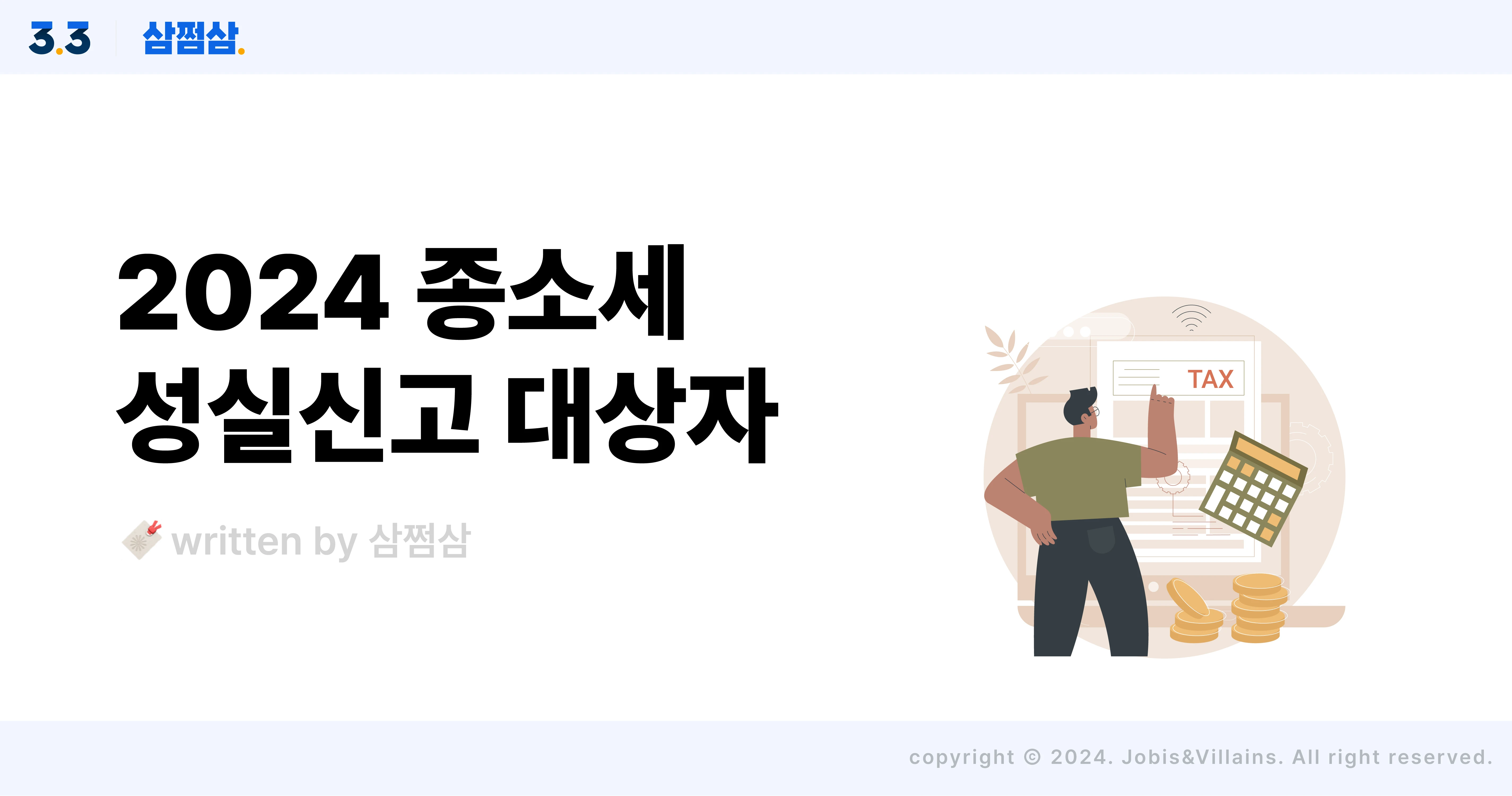 종합소득세 성실신고 확인 대상자 요약 (2024) 성실신고 확인 대상자 기준 종합소득세 정기 신고 기간을 한 달 연장해 주는 성실신고 대상자는 누구이며, 업종별로 소득별로 어떤 기준을 충족해야 하는지 삼쩜삼에서 정리해 드려요. 성실신고 확인제도가 대체 뭔가요? 모든 사업자는 장부를 기장해 제출할 의무가 있어요. 그런데 수입 규모가 클수록 수입 및 지출 구조가 복잡해지면서 그에 따라 장부 작성에도 오차가 발생하기 쉬워요. 개인이 이런 오차를 잡아내긴 어렵고, 과세 관청 역시 종합소득세 시즌에 밀려오는 신고서를 일일이 다 면밀하게 검토하려면 너무 시간이 오래 걸려요. 그래서 한 가지 방법을 마련해뒀는데요. 바로 성실신고 확인제라고 해요. 업종별로 수입 금액 기준을 정해두고, 그 기준을 넘어서는 사업자는 장부기장 내용의 정확성 여부를 세무사나 공인회계사 등에게 확인받은 후에 신고하게 하는 거죠. 쉽게 말해, 수입 규모가 큰 사장님들의 정확한 성실신고를 유도하기 위해 도입된 제도라고 생각하시면 돼요. 성실신고 대상자 기준 수입 금액은 얼마? 성실신고 대상자 기준 수입 금액은 업종별로 다른데요. 구체적으로 살펴보면, 아래와 같아요. 업종별 해당 연도 수입 금액 농업·임업 및 어업, 광업, 도매 및 소매업(상품중개업을 제외한다), 부동산매매업 해당 연도 수입 금액 15억 원 이상 제조업, 숙박 및 음식점업, 전기·가스·증기 및 공기조절 공급업, 수도·하수·폐기물처리·원료재생업, 건설업(비주거용 건물 건설업은 제외), 부동산 개발 및 공급업(주거용 건물 개발 및 공급업에 한함), 운수업 및 창고업, 정보통신업, 금융 및 보험업, 상품중개업 해당 연도 수입금액 7.5억 원 이상 부동산 임대업, 부동산업(부동산매매업은 제외한다), 전문·과학 및 기술 서비스업, 사업시설관리·사업지원 및 임대서비스업, 교육 서비스업, 보건업 및 사회복지 서비스업, 예술·스포츠 및 여가관련 서비스업, 협회 및 단체, 수리 및 기타 개인 서비스업, 가구내 고용활동 해당 연도 수입금액 5억 원 이상 여기서 말하는 수입 금액은, 단순히 한 해 매출을 얘기하는 게 아니라 1년 동안 벌어들인 돈, 또는 금전가치로 환산할 수 있는 모든 걸 말해요. 그래서 임대료나 판매 장려금, 재고 자산의 시가 상당액도 포함해 수입 금액을 따집니다. ➕잠깐, 성실사업자 기준은? 소득세법상 일정 소득 기준을 충족하는 사업자 자체를 성실사업자라고 불러요. 성실사업자 기준은 아래와 같이 몇 가지가 있어요. <성실사업자 기준> 사업용 계좌 사용 *사용해야 할 금액 중 미사용 금액 비중이 3분의 1을 초과하지 않아야 함 (*금융회사를 통한 거래대금 결제, 인건비와 임차료 등 거래 대금) 카드 가맹점 가입 장부 기장 필수 성실신고 확인 대상자가 쓴 돈, 별도로 세액공제받을 수 있어요 성실신고 확인 대상자는 장부기장 내용의 정확성 여부를 확인해 줄 수 있는 세무 전문가에게 확인을 의뢰해야 하는데요. 세무사를 비롯해 공인회계사, 세무법인, 회계법인이 성실신고확인을 할 수 있어요. 이러한 확인 의무 때문에 신고 및 납부 기한이 1개월 더 늘어난 셈인데, 성실신고 대상자는 세무 전문가에게 확인을 의뢰하는 과정에서 추가 비용이 들어 부담스러울 거예요. 수입 금액이 클수록 의뢰비 역시 높아질 테니까요. 하지만, 너무 걱정하지 않아도 돼요. 성실신고 확인에 직접 사용한 비용의 100분의 60은 사업소득에 대한 소득세에서 공제해 주거든요. 다만, 해당 과세 연도의 사업소득 금액을 과소 신고한 경우, 그 과소 신고한 사업소득 금액이 경정된 사업소득 금액의 100분의 10 이상인 경우라면 다음 과세 연도부터 3개 과세 연도 동안 성실신고 확인비용에 대한 세액공제를 받지 못한다는 점, 유념해 주세요. 만일 성실신고하지 않았다면? 왜, 종합소득세 신고기한을 못 지켰을 때나 과소 신고했을 때 가산세를 물잖아요. 그것처럼 ✅ 성실신고 확인 대상자가 성실신고하지 않았을 때, 납세 의무를 다하지 않았으니 이에 대해 가산세가 발생하는데요. ① 산출 세액 × (미제출 사업장의 소득 금액 / 종합소득 금액) × 5% ② 사업소득 총수입금액 × 0.02% 이 두 가지 중에서 더 큰 금액을 가산세로 물게 돼요. 여기에다가 ✅ 무신고가산세, 무기장가산세는 별도로 적용돼 부과된답니다. 또, ✅ 납세협력의무를 이행하지 않은 것에 대해 괘씸죄로 수시 세무조사대상으로 선정될 수도 있어요. 만일 세무 대리인이 성실신고확인을 제대로 하지 못한 사실이 밝혀진다면? ✅ 성실신고확인 세무 대리인도 징계를 받을 수 있다는 점 꼭 기억해 두세요! 소득뿐아니라 그에 따른 장부 작성도 복잡한 성실신고 대상자. 6월 기한에 맞추어 성실신고하고 성실싱고 확인 비용으로 쓴 돈은 꼭 세액공제 신청하세요! - 해당 콘텐츠는 2024. 6. 13 기준으로 작성되었습니다. - 해당 콘텐츠의 내용은 일반적인 정보를 참고 목적으로만 제공하고 있으며, 개개인의 상황에 따라 달리 적용될 수 있습니다. 따라서 콘텐츠를 통해 취득한 일반적인 정보로 인한 직간접적 손해에 대해서 당사는 법적 책임을 지지 않음을 알려드립니다. ⓒ자비스앤빌런즈, 무단 전제