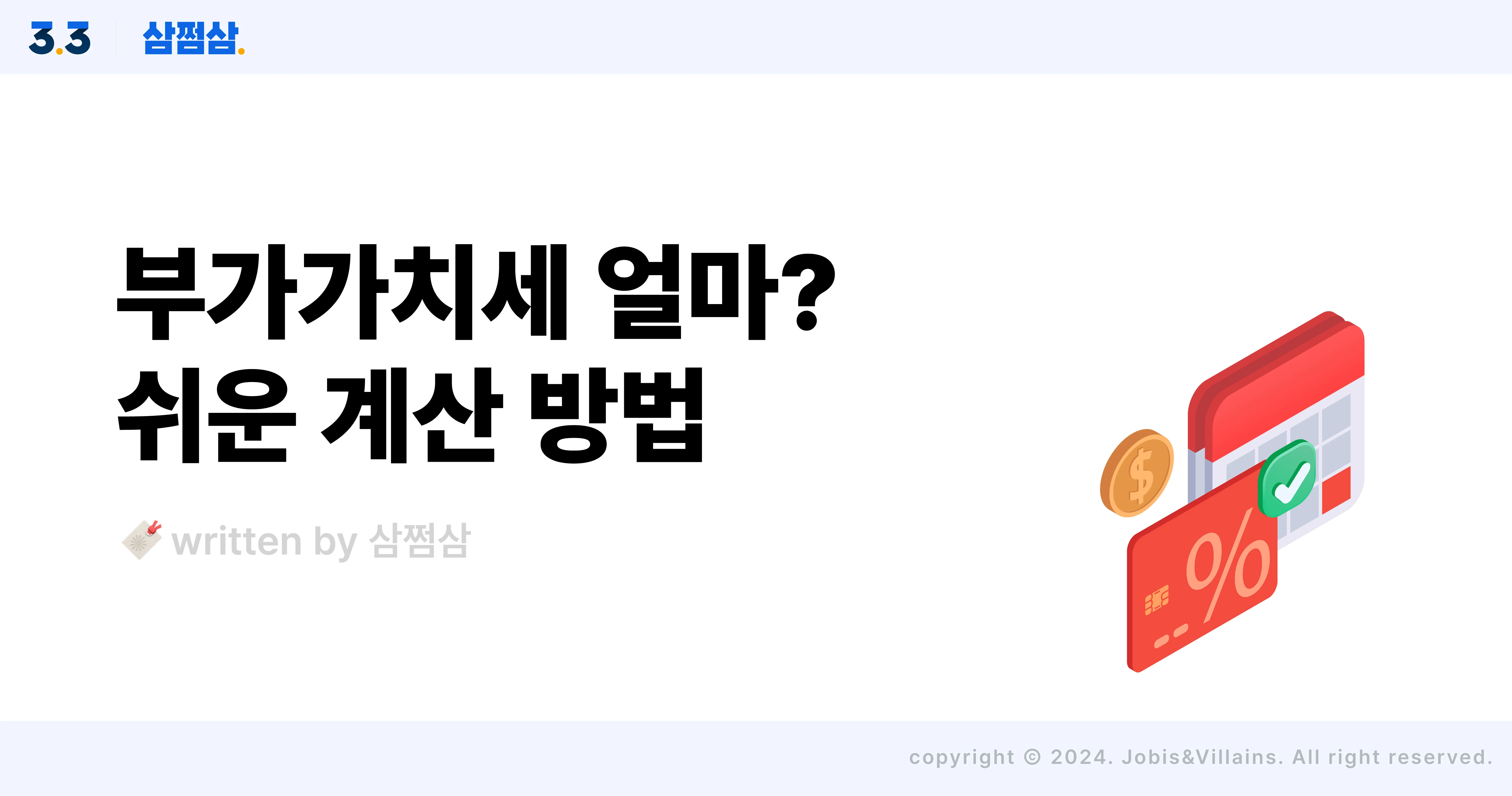 2024 부가세 계산 방법 30초 요약정리 부가세 계산 방법 부가세 확정신고 기간이 돌아왔어요. 그래서 오늘은 부가세 계산하는 방법을 정리해 봤어요. 마땅히 절세 방법이 없는 부가세! 하지만 부가세 계산 방법과 세액 계산 흐름을 알아두면 조금이나마 똑똑한 부가세 신고에 도움이 될 거예요. 간단하게 알아보는 부가세 계산 방법 사실 사장님이 아니더라도 누구나 한 번쯤 들어봤을 부가세. 바로 상품 어디서나 볼 수 있는 “VAT 별도 계산”이라는 문구 때문인데요. ‘VAT’는 ‘부가가치세’이고, ‘VAT를 별도로 계산한다’는 건 곧 부가세를 따로 받겠다는 뜻이죠. 부가세는 상품의 거래나 서비스의 제공 과정에 얻게 되는 부가가치(이윤)에 대해 과세하는 세금이기 때문에, 필연적으로 중복 계산하게 돼요. 그래서 보통은 최종소비자가 먼저 부담하며, ‘매출세액’에서 ‘매입세액’을 뺀 값을 계산해 사업자가 최종 신고 및 납부하게 되죠. ※ 부가가치세 = 매출세액 - 매입세액 ・ 매출세액: 상품/서비스를 판매할 때 부과하는 부가세 ・ 매입세액: 상품/서비스를 구매할 때 지불하는 부가세 따라서 매출세액이 많다면 납부해야 하는 부가세가 많아지고, 반대로 매입세액이 많다면 부가세를 환급받을 수도 있어요. 과세자 종류에 따른 차이도 있어요 좀 더 정확한 계산을 위해서는 과세자 종류도 체크해야 하는데요. 일반과세자(연간 매출 8,000만 원 이상)는 10% 세율이 적용되는 부가가치세 계산 공식을 따르지만, 간이과세자(연 매출 8,000만 원 미만)는 1.5~4%의 낮은 세율을 적용해 납부세액을 계산해요. 그렇다고 간이과세자가 무조건 유리한 건 아니에요. 매입액의 0.5%만 공제받을 수 있다는 아쉬움도 존재한답니다. 부가세 계산 흐름 마지막으로 일반과세자와 간이과세자의 부가세 계산 흐름을 간단하게 정리해 볼까요? 아래 계산식을 보면 부가세가 어떻게 계산되는지 쉽게 이해할 수 있을 거예요. 1) 일반과세자 ① 매출세액: 과세분 + 영세율(수출) + 예정신고 누락분 ± 대손세액 가감 ② 매입세액: 세금계산서 수취분 + 예정신고 누락분 + 그 밖의 공제 매입세액 - 공제받지 못할 매입세액 ③ 납부세액: ① - ② 2) 간이과세자 ① 매출세액: 과세분 + 영세율 적용분 + 재고납부세액 ② 공제세액: 매입 세금계산서 등 수취세액 공제 + 의제매입세액공제 + 매입자발행 세금계산서 세액공제 +전자신고 세액공제 + 신용카드 매출전표 등 발행 세액 공제 ③ 납부세액: ① - ② 물론 이 흐름은 아주 간단하게 정리한 거예요. 실제로 계산할 때는 가산세가 붙거나 예정(신고) 세액이 차감되기도 합니다. 이럴 땐, 세무전문가의 도움을 받는 것도 좋은 방법이에요. 30% 할인받고 똑똑하게 부가세 신고하자! 다른 세금과 마찬가지로 부가세 역시 똑똑하게 절세하고 싶다면 세무 전문가의 도움을 받는 게 좋아요. 아무래도 생업으로 바쁜 날을 보내다 보면 부가세 신고를 위해 시간을 할애한다는 게 쉽지 않거든요. 부가세 신고가 쉽고 빨라야 하는 이유이기도 하죠. 이미 260만 사업자 회원분들이 이용하고 있는 삼쩜삼은 이 모든 어려움을 해결해 드려요. 특히, 이번 부가세 신고는 부가세 신고 비용 30%를 삼쩜삼이 지원해 드리는데요. 7월 10일까지 아래 링크를 통해 할인쿠폰을 다운로드할 수 있어요. 이 글을 읽고 계시다면 미리미리 다운로드해두는 게 좋겠죠? 👉🏻부가세 신고 30% 할인 쿠폰 다운 받으러 가기 2024년 부가세 확정신고 기간이 다가오고 있어요. '올해는 어떻게 부가세 신고하나' 고민하셨다면 주저 말고 삼쩜삼을 이용해 주세요. 삼쩜삼이 사업자 여러분의 세무 길잡이가 되어드리겠습니다! - 해당 콘텐츠는 2024. 6. 26 기준으로 작성되었습니다. - 해당 콘텐츠의 내용은 일반적인 정보를 참고 목적으로만 제공하고 있으며, 개개인의 상황에 따라 달리 적용될 수 있습니다. 따라서 콘텐츠를 통해 취득한 일반적인 정보로 인한 직간접적 손해에 대해서 당사는 법적 책임을 지지 않음을 알려드립니다. ⓒ자비스앤빌런즈, 무단 전제 및 배포 금지 2024_7월_부가세_신고_세금_계산_방법1.webp300 킬로바이트 2024_7월_부가세_신고_세금_계산_방법2.webp300 킬로바이트 2024_7월_부가세_신고_세금_계산_방법_직사각.webp100 킬로바이트 도움이 되었습니까? 예 아니요 3명 중 2명이 도움이 되었다고 했습니다. 어떤 부분이 아쉬웠나요? 도움말에 대한 피드백을 남겨주세요.
