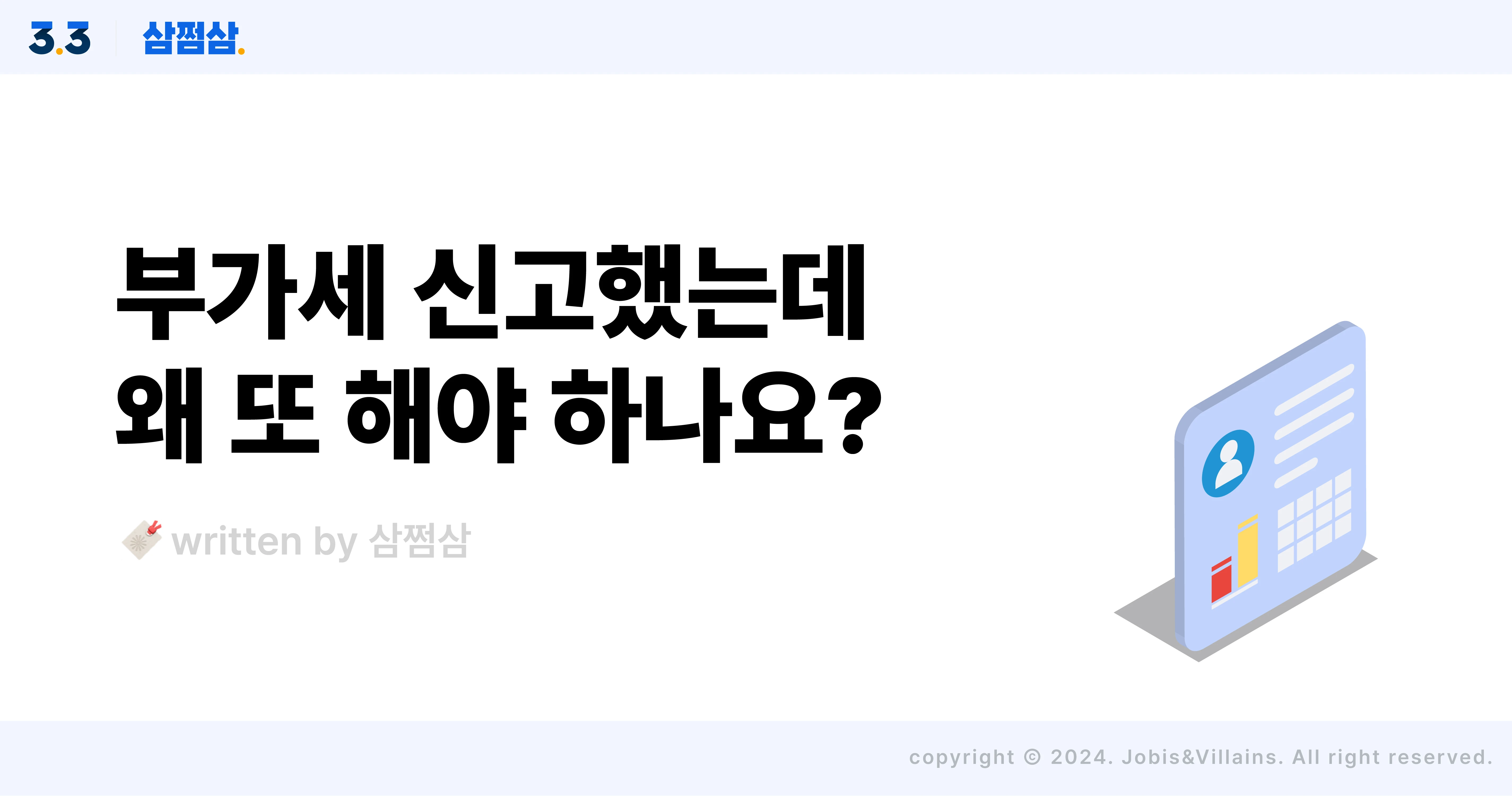 부가가치세 확정신고, 예정신고와 예정고지 차이점은? 부가가치세 확정신고 예정신고 예정고지 차이점 종합소득세 신고는 1년에 한 번인데 부가가치세는 확정신고며 예정신고, 예정고지까지. 뭐가 이렇게 복잡한 걸까요? 오늘은 확정신고 시즌을 맞아 부가가치세 예정신고 확정신고 차이를 알아보고, 또 예정고지와는 뭐가 다른 건지 살펴 볼텐데요. 사업자 유형별 부가세 신고 루틴을 중심으로 정리해 볼게요! 부가세 신고? 1년에 4번? 부가가치세는 6개월을 과세기간으로 해 신고 및 납부하는데요. 각 과세기간을 다시 3개월로 나눠 중간에 예정신고 기간을 두고 있어요. 즉, 상반기에 진행하는 게 제1기 확정신고(예정신고)고, 하반기에 진행하는 게 제2기 확정신고(예정신고)죠. 아래 표를 보면 아시겠지만, 개인 일반사업자는 상반기, 하반기 모두 확정신고만 하면 되고, 법인사업자는 예정신고와 확정신고 둘 모두를 해야 해요. 정리하자면, ✅ 개인 일반사업자는 제1기 확정신고-제2기 확정신고 ✅ 법인사업자는 제1기 예정신고- 제1기 확정신고 – 제2기 예정신고 – 제2기 확정신고 를 하게 되는 셈이죠. 과세기간 과세대상 기간 신고납부 기간 신고 대상자 제1기1.1~6.30 예정신고 1.1~3.31 4.1~4.25 법인사업자 확정신고 4.1~6.30 7.1~7.25 법인사업자 1.1~6.30 7.1~7.25 개인일반사업자 제2기7.1~12.31 예정신고 7.1~9.30 10.1~10.25 법인사업자 확정신고 10.1~12.31 다음해 1.1~1.25 법인사업자 7.1~12.31 다음해 1.1~1.25 개인일반사업자 부가가치세 예정신고 확정신고 차이는? 부가가치세 예정신고 확정신고 차이는 기간에 있어요. 예정신고는 중간예납 개념으로, 확정신고를 앞두고 일정금액의 부가세를 미리 납부하는 거라고 볼 수 있는데요. 사업자가 한 번에 내야 하는 세금 부담을 줄이고, 국가 차원에서도 세수 확보를 좀 더 용이하게 하기 위해 만들어진 제도랍니다. 단, 소규모 법인이라면 부가가치세 예정신고의 의무는 없어요. 여기서 말하는 소규모 법인의 기준은, 직전 과세기간 공급가액의 합계액이 1억 5천만 원 미만으로 2021년부터 예정신고 의무가 면제됐어요. 대신, 소규모 법인과 개인 일반사업자는 ‘예정고지’ 예정신고? 예정고지? 그게 그거 아니냐고요? 비슷해 보이는 단어이지만 이 둘은 엄연히 달라요. 아, 물론 둘 다 중간예납 성격을 가진 건 맞지만, <신고>는 납세자가 자진 신고하는 형태고, <고지>는 신고하지 않아도 알아서 얼마를 내야 할지 알려준다는 차이가 있죠. 소규모 법인이나 개인사업자는 1년에 4번이나 되는 부가세 신고를 감당하긴 힘들잖아요? 그래서 직전 과세기간 6개월 납부세액의 50%를 고지 받아 납부하는 거예요. 예정고지된 세액은 확정신고할 때 기납부세액(미리 낸 세금)으로 차감된답니다. ※예정고지 대상자는 세액 조회할 수 있어요! 예정고지 대상자 조회: 홈택스 > 세금신고 > 부가가치세 신고 > 신고도움 자료 조회 > 부가가치세 예정고지(부과) 대상자 조회 예정고지 세액 조회: 홈택스 > 세금신고 > 부가가치세 신고 > 신고도움 자료 조회 > 부가가치세 예정고지(부과) 세액 조회 ➕ Tip. 예정고지 된 세액을 납부하기 힘들다면? 휴업해서, 실적이 좋지 않아서 등 여러 이유로 예정고지된 세액을 납부하기 힘들다면 납부기한 연장을 신청해 볼 수 있어요. [홈택스 > 국세 증명·사업자등록·세금 관련 신청/신고 > 세금 관련 신청·신고 공통분야 > 신고·납부 기한 연장 신청/내역 조회 > 고지분 납부기한 등 연장 신청(구. 징수유예)] 단, 납부 마감일 3일 전에는 신청해야 하는데요. 그럼, 세무서가 세금 납부가 세금 납부가 어려운 사유에 대한 사실관계를 검토하고 승인 여부를 결정해요. 만일 신청이 승인된다면, 3개월 이내에서 납부기한이 연장됩니다. 다시 한번 정리! 사업자 유형별 부가세 신고 및 납부 일정 Q. 개인사업자, 소규모 법인사업자라면? 1) 국세청이 부가세 예정고지서 발송 → 4월 25일까지 납부 2) 개인사업자, 소규모 법인사업자가 부가세 1기 확정신고 → 7월 1일부터~25일까지 납부 3) 국세청이 부가세 예정고지서 발송 → 10월 25일까지 납부 4) 개인사업자, 소규모 법인사업자가 부가세 2기 확정신고 → 다음 해 1월 1일부터~25일까지 납부 Q. 법인 사업자라면? 1) 법인사업자가 부가세 1기 예정신고 → 4월 1일부터~25일까지 납부 2) 법인사업자가 부가세 1기 확정신고 → 7월 1일부터~25일까지 납부 3) 법인사업자가 부가세 2기 예정신고 → 10월 1일부터~10월 25일까지 납부 4) 법인사업자가 부가세 2기 확정신고 → 다음 해 1월 1일부터~25일까지 납부 Q. 간이과세자라면? 1) 간이과세자가 예정신고 → 7월 25일까지 납부 2) 간이과세자가 확정신고 → 다음해 1월 25일까지 납부 참고로 직전연도 공급대가 합계액이 8천만 원 미만인 개인사업자는 간이과세자에 해당해요. 그리고 올해 7월 1일부터는 이 간이과세자 기준이 1억 4천 만원 미만으로 상향 조정된다는 것도 알아두세요. 2024년 부가세 확정신고는 삼쩜삼에서! 오늘 알려드렸듯이 부가세 확정신고가 코앞으로 다가왔어요. 말 그대로 확정'신고'는 고지된 금액을 납부만 하면 되는 게 아니라 절차에 따라 스스로 신고하고 세액을 납부해야만 하는데요. 사
