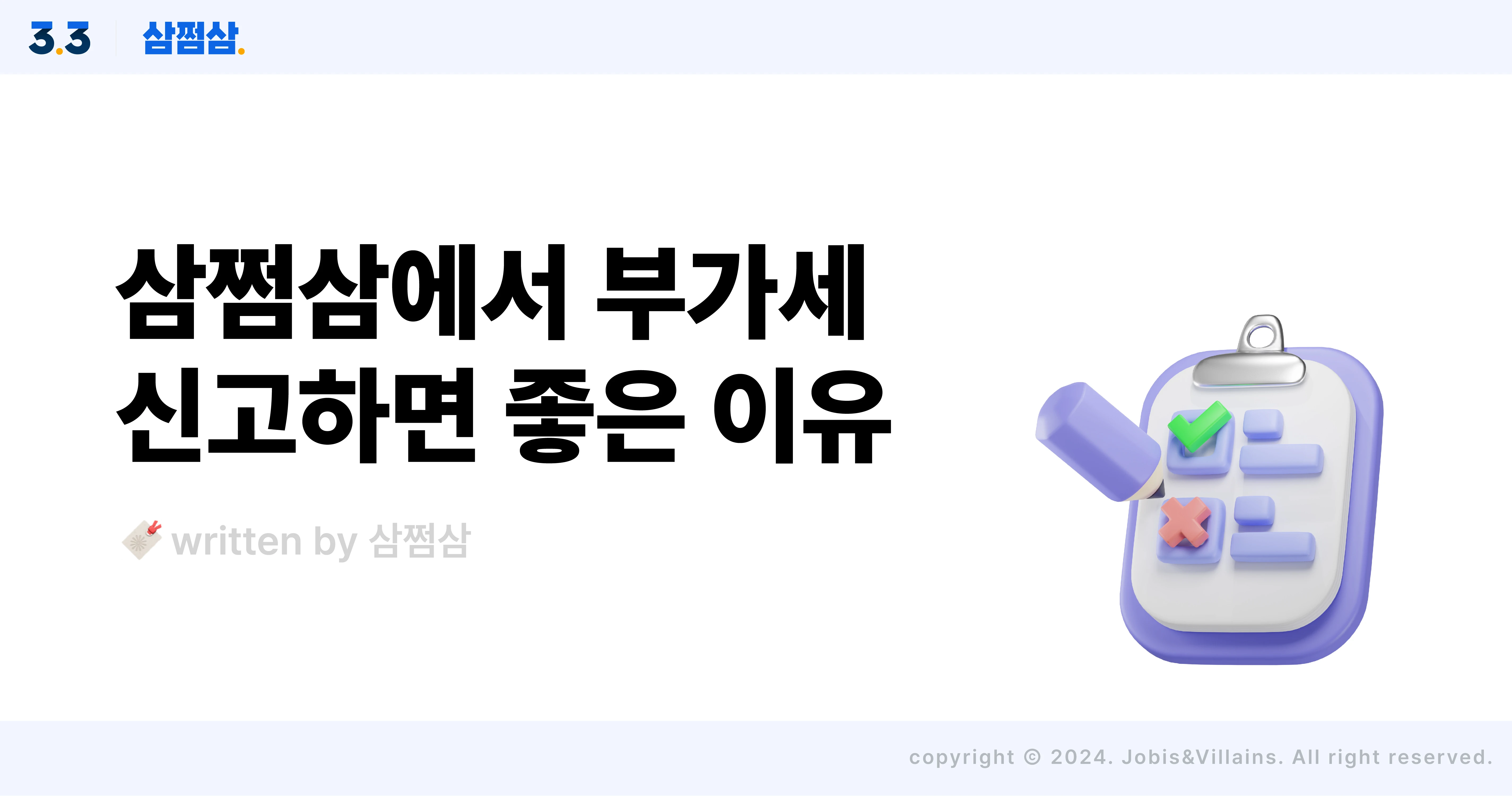 삼쩜삼에서 부가세 신고 서비스 이용하면 좋은 이유 삼쩜삼 부가세 신고 서비스 소개 부가세 확정신고 기간입니다. 오늘은 부가세 신고 기간 및 대상자를 살펴보고, 삼쩜삼 부가세 신고 서비스에 대해 자세히 알려드리도록 할게요. 부가세 신고 기간 과세대상 1~3월분 4~6월분 7~9월분 10~12월분 납부시기 4월 1일~ 4월 25일까지 7월 1일~ 7월 25일까지 10월 1일~ 10월 25일까지 다음 해 1월 1일~ 1월 25일까지 개인 간이과세 X 예정고지(1~6월분) X 확정신고(1~12월분) 일반과세 예정고지 확정신고 예정고지 확정신고 개인사업자는 매년 두 번에 걸쳐 부가세를 신고하고 납부하는데요. 상반기 1기는 1월 1일~6월 30일을 과세기간으로 해 7월 25일까지 신고 납부하고, 하반기인 2기는 7월 1일~12월 31일을 과세기간으로 해 다음 해 1월 25일까지 신고 납부하죠. 그런데, 부가세는 세금 중에서도 그 볼륨이 커서, 한 번에 6개월 치 부가세를 납부하려면 꽤 부담스러울 수 있어요. 그래서 <예정고지>라는 제도를 둬서 상반기 1기의 부가세액의 절반은 4월에, 하반기 2기의 부가세액의 절반은 10월에 나눠서 낼 수 있도록 하고 있답니다. 그런데 여기서 한 가지 의문점이 생기죠? ‘상반기가 다 지나지 않았는데, 상반기 부가세 세금이 얼마나 나올지 알고 절반이 고지된다는 거지?’라는 의문요. 예정고지 세액은 국세청에서 고지하는 것으로, 직전 과세기간 납부세액의 50%로 결정돼요. 만일 그 금액이 50만 원 미만이라면 예정고지 대상에서 제외돼 고지서가 발송되지 않지만요. 현재 7월 부가세 신고 기간은 <확정신고> 기간으로, 올해 상반기 부가세를 신고 및 납부하면 되는데요. 지난 4월에 예정고지 세액을 납부하셨잖아요? 그래서 7월엔 4월에 나눠 낸 금액을 차감하고 나서 부가세를 내면 되는 거랍니다. 부가세 신고 대상자 부가세 신고 대상자는 일단 면세사업자를 제외한 모든 사업자예요. 단, 매출 기준으로 일반과세 vs 간이과세가 나뉘는데요. 기존의 간이과세자 기준은 부가세 포함 매출액이 8천만 원 미만인 개인사업자였는데요. 올해 7월 1일부터는 이 기준이 1억 4백만 원으로 확 올랐어요. 즉, 소득이 1억 4백만 원이 안 된다면 간이과세 혜택을 볼 수 있다는 뜻이죠. 이때, 같은 간이과세자라고 하더라도 매출에 따라 다른 의무가 적용되는데요. 일단 소득이 4,800만 원이 안 된다면 부가세를 내지 않아도 된답니다. Q. 부가세 내지 않아도 되는 사업자 또 있다던데? A. 맞아요. 아예 부가세가 면제되는 업종을 운영하는 사업자는 면세사업자로, 부가세 신고 및 납부 의무가 없죠. 그리고 이러한 면세사업자 업종에는 대표적으로 병원, 치과, 한의원, 입시학원, 외국어 학원, 농산물, 축산물, 수산물 도소매 업체, 주택, 부동산 관련 서비스 등이 있답니다. 삼쩜삼 부가세 신고 서비스도 있다고? 많은 분들이 '삼쩜삼=종합소득세 신고'라고만 생각하실 텐데요. 지난해 1월부터는 개인사업자 분들의 부가세 신고도 도와드리고 있어요. 이미 260만 사업자 회원분들과 함께 하고 있는걸요? 삼쩜삼 부가세 신고 서비스를 이용하면 이런 게 좋아요. ① 부가가치세 예상 세액을 무료로 확인하고, 신고할 수 있어요. ② 직전 부가가치세 신고 결과와 올해의 예상 세액까지 무료로 확인할 수 있어요. ③ 나의 매출/매입 리스트와 공제 내역을 확인하고 수정할 수 있어요. 삼쩜삼 부가세 신고가 완료되면, 보다 정확한 신고를 위해 삼쩜삼과 파트너 세무사가 신청 내역을 검토하는데요. 검토는 최대 5일 정도가 소요되며, 이후의 진행 상황은 카카오톡 알림 톡으로 모두 안내해 드리고 있답니다. 삼쩜삼 부가세 신고, 믿고 맡겨도 좋은 이유 ✅ 공인인증서 없이 카카오톡 간편 인증만으로 매출과 매입 분석까지 진행! (세무대리인 지정도 되지 않아요.) ✅ 신고 기간 동안의 매출을 구성별로 자세히 확인! (이때, 종이세금계산서나 안 되는 카드 매출, 매입 등도 수기로 작성할 수 있어요.) ✅ 7월에 삼쩜삼에서 신고하면 나의 매출, 매입 데이터를 기반으로 업종별 최적 세액까지 확인 가능! (참고로 부가세 예상 조액 조회는 간이/일반 과세자, 매출이 없는 신규 사업자, 휴업 사업자 모두 무료로 조회해 볼 수도 있어요.) 이처럼 삼쩜삼은 사업자 여러분의 부가세 신고를 보다 쉽고 스마트하게 도와드리고 있어요. 그러니 올해 7월 부가세 확정신고는 삼쩜삼과 함께 하세요! 아 참, 7월 10일 딱 오늘까지 부가세 신고료 30% 할인 쿠폰을 드리고 있으니 아래 링크를 눌러 쿠폰을 받아주세요. 👉🏻삼쩜삼 부가세 신고료 30% 할인 쿠폰 받으러 가기 - 해당 콘텐츠는 2024. 7. 10 기준으로 작성되었습니다. - 해당 콘텐츠의 내용은 일반적인 정보를 참고 목적으로만 제공하고 있으며, 개개인의 상황에 따라 달리 적용될 수 있습니다. 따라서 콘텐츠를 통해 취득한 일반적인 정보로 인한 직간접적 손해에 대해서 당사는 법적 책임을 지지 않음을 알려드립니다. ⓒ자비스앤빌런즈, 무단 전제 및 배포 금지 삼쩜삼_부가세_신고_서비스_예상세액_신고기간_대상자_직사각.webp100 킬로바이트 삼쩜삼_부가세_신고_서비스_예상세액_신고기간_대상자2.webp300 킬로바이트 삼쩜삼_부가세_신고_서비스_예상