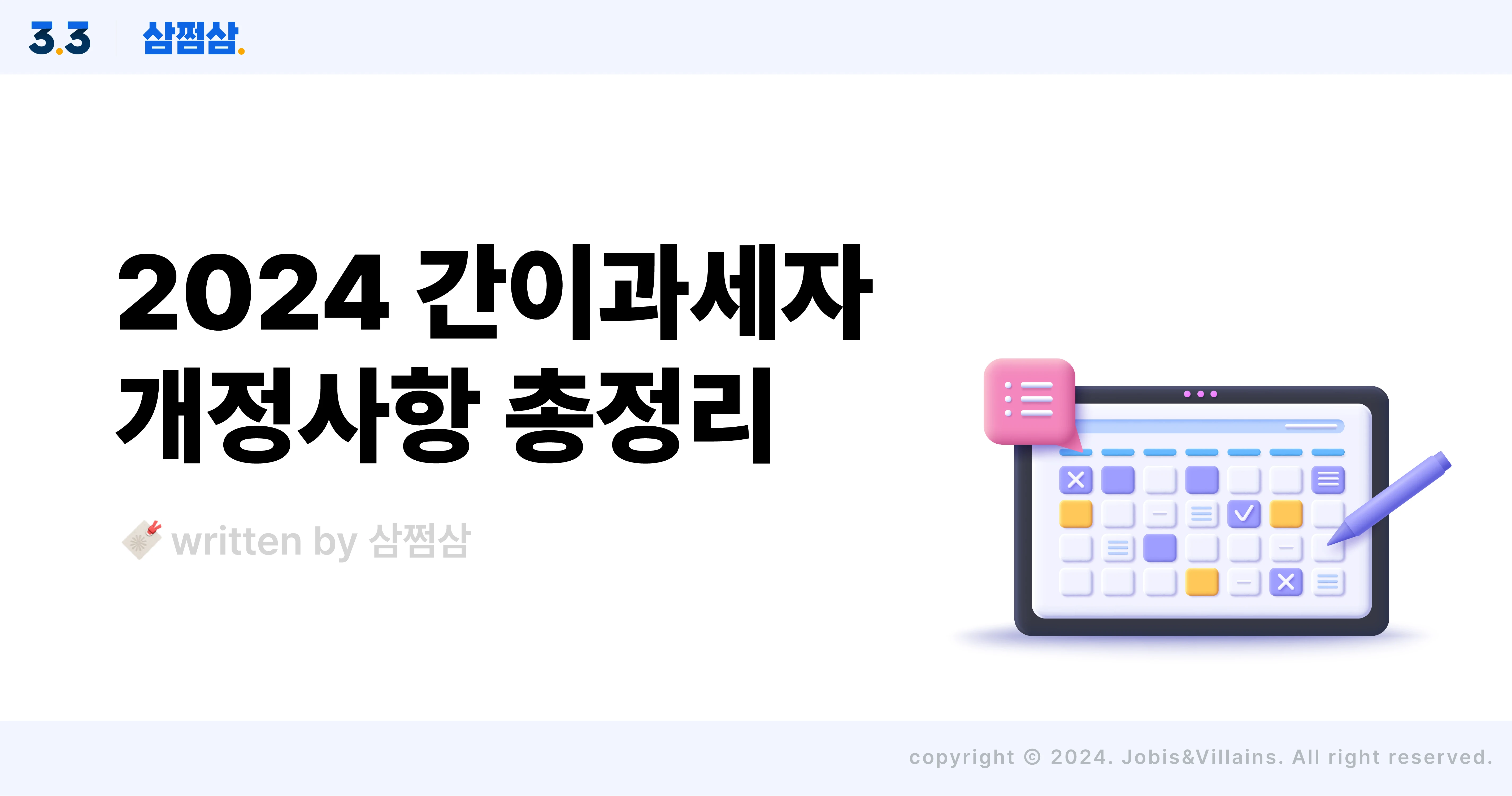 간이과세자 기준 상향 등 부가세 신고 개정사항 요약정리 간이과세자 부가세 신고 개정사항 2024년 7월부터 적용되는 간이과세자 기준 상향 소식! 더 많은 사업자분들이 간이과세 혜택을 볼 수 있을 것으로 예상하는데요. 간이과세자 부가세 신고에 있어 또 어떤 부분들이 바뀌었는지 함께 살펴볼게요. 일반과세 vs 간이과세 뭐가 달라? 일반과세자와 간이과세자의 가장 큰 차이는 ‘부가세율’이에요. 일반과세자는 통상 매출액의 10%를 부가세로 내지만, 간이과세자는 1.5~4%의 낮은 부가세율이 적용되거든요. 또, 일반과세자는 6개월을 과세기간으로 해 1년에 2회 부가세를 신고하며, 각 과세기간을 3개월로 나눠 예정고지 기간을 두고 있고요. 하지만 간이과세자는 1년에 딱 한 번만 부가세 신고를 하면 되니 그 절차가 훨씬 간편하답니다. 일반과세와 간이과세의 차이점을 알았으니, 이제 본격적으로 간이과세자 부가세 신고 개정사항을 파헤쳐 볼게요 01. 간이과세자 기준 상향됐어요 기존 개정 직전 연도 공급대가 8,000만 원 미만 직전 연도 공급대가 1억 400만 원 미만 *공급대가: 부가세가 포함된 가액(간이과세자는 보통 매출액을 공급대가라고 함) 기존에는 8000만 원 미만이면 간이과세, 그 이상이면 일반과세를 해야 했죠. 그런데, 7월부터는 영세 자영업자의 세금 부담을 덜고자 간이과세 기준금액이 1억 400만 원으로 상향했어요. 이로 인해 직전 연도 매출액이 1억 400만 원을 초과하지 않는 사장님들은 간이과세의 혜택을 볼 수 있게 됐어요. 피부미용업(피부관리)이나 기타미용업(네일아트)에 종사하는 사장님이라면 반길 만한 소식도 있어요. 원래 특별·광역시 등에 소재하는 피부·기타 미용업 사장님들은 사업장 면적이 40㎡ 이상이면 매출액과 관계없이 간이과세 적용을 할 수 없었어요. 하지만 7월부터는 면적과 관계 없이 매출액 기준만 충족하면 간이과세가 가능해진다는 사실! 다만 부동산임대업, 과세유흥장소 경영 사장님들은 여전히 종전 간이과세 기준금액인 4,800만 원이 적용됩니다. 02. 전자세금계산서 발급 의무가 확대돼요 기존 개정 직전 연도 공급가액 1억 원 이상 직전 연도 공급가액 8천만 원 이상 *공급가액: 부가세를 뺀 물건값 본래 직전연도 사업장별 재화 및 용역의 공급가액이 1억 원 이상인 사장님들은 누구나 전자세금계산서 의무발급 대상이었어요. 그런데, 이번 개정으로 전자세금계산서 발급 의무 기준이 8천만 원 이상으로 확대됐어요. 이는 ‘일반과세냐 간이과세냐’에 관계 없이 적용되는 사항인데요. 해당 사장님들에겐 의무발급 통지서를 발송하였으며, 홈택스 ‘My홈택스’ 메뉴에서 직접 대상자 여부를 확인할 수 있어요. *홈택스 로그인 ▸ My홈택스 ▸ 전자세금계산서 ▸ 발급의무 대상자 확인 03. 신용카드 등 사용에 따른 세액공제 기간이 확대됩니다 부가세가 과세되는 물품을 공급하고 신용카드 매출전표를 발급하면 일정 비율만큼 납부세액에서 공제받는 제도가 있어요. 바로 ‘신용카드 매출전표 발행 세액공제’인데요. 신규 간이과세자 및 직전연도 공급대가가 4,800만 원 미만인 간이과세자(업종불문)가 지원 대상이랍니다. 공제 한도는 연간 1천만 원으로 하며, *신용카드매출전표 등 발행금액의 1.3%를 부가가치세 납부세액에서 공제해 줘요. 이 제도는 원래 2023년 12월 31일까지 적용될 예정이었으나 2026년 12월 31일까지로 그 기간이 연장됐어요. *신용카드매출전표 등이란? 신용카드매출전표 및 현금영수증 직불카드영수증, 결제대행업체를 통한 신용카드매출전표, 실제 명의가 확인되는 선불카드 직불전자지급수단영수증, 실제 명의가 확인되는 선불전자지급수단영수증 전자화폐 04. 간이과세자 포기 간이과세자 기준에 해당한다고 해서 간이과세자를 꼭 유지해야 하는 건 아니에요. 간이과세를 포기하고 일반과세자로 전환할 수도 있어요. 이때, 간이과세 포기 이후에는 다시 간이과세로 전환하고 싶어도 3년 내로는 전환이 불가능했어요. 그런데, 이 부분도 개정돼 일정 요건을 충족한 개인사업자는 다시 변경 신청을 통해 간이과세자로 변경이 가능해져요. 지금까지 간이과세자 부가세 신고 관련 개정사항에 대해 알아봤는데요. 간이과세자 대상 폭이 넓어진 만큼 혜택 잘 누려서 절세에도 톡톡히 효과보시길 바랄게요! - 해당 콘텐츠는 2024. 7. 19 기준으로 작성되었습니다. - 해당 콘텐츠의 내용은 일반적인 정보를 참고 목적으로만 제공하고 있으며, 개개인의 상황에 따라 달리 적용될 수 있습니다. 따라서 콘텐츠를 통해 취득한 일반적인 정보로 인한 직간접적 손해에 대해서 당사는 법적 책임을 지지 않음을 알려드립니다. ⓒ자비스앤빌런즈, 무단 전제 및 배포 금지 간이과세자_기준_개정안_정리_세금계산서_발급_세율_직사각.webp100 킬로바이트 간이과세자_기준_개정안_정리_세금계산서_발급_세율_직사각1.webp200 킬로바이트 간이과세자_기준_개정안_정리_세금계산서_발급_세율_직사각2.webp300 킬로바이트 간이과세자_기준_개정안_정리_세금계산서_발급_세율_직사각4.webp200 킬로바이트 간이과세자_기준_개정안_정리_세금계산서_발급_세율_직사각3.webp300 킬로바이트 도움이
