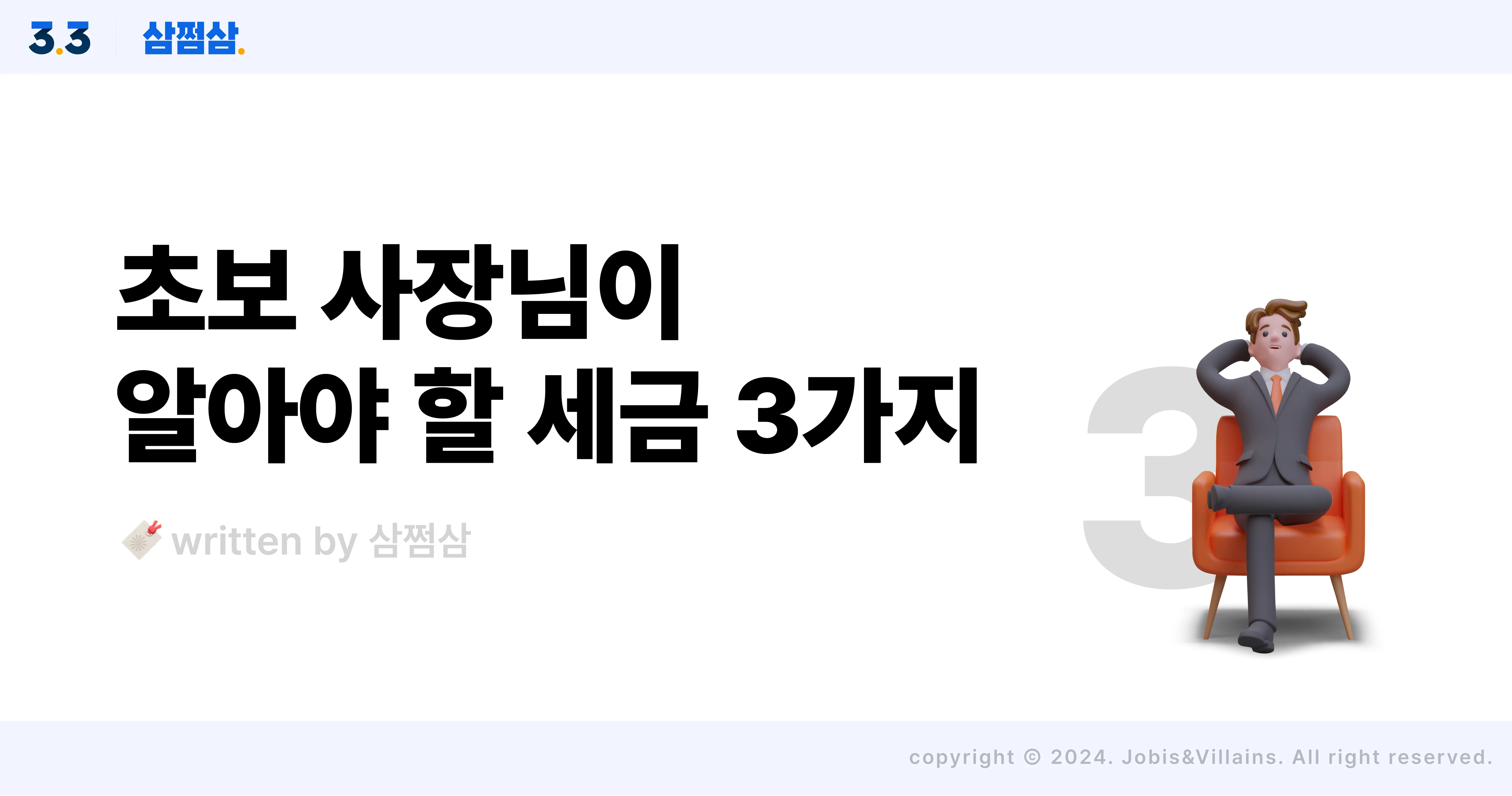 초보 개인사업자가 알아야 할 최소한의 세금 3가지 개인사업자 세금 3가지 넉넉한 자본을 들고 사업을 시작하는 분들은 별로 없어요. 대부분 허리띠를 졸라매며 사업을 시작하기 때문에 돈 문제에 민감한 것도 당연하죠. 그중에서도 세금은 어떻게든 줄이고 싶은 지출 중 하나인데요. 세금에 대한 기본 지식만 잘 갖추어도 반은 성공한 셈이랍니다. 그래서 오늘은 초보 사장님들이 세금에 미리 대응할 수 있도록 꼭 알아야 할 개인사업자 세금 3가지를 정리해 알려드릴게요. 매년 5월 한 달은 종합소득세 시즌이에요 종합소득세? 말 그대로 지난 1년간 벌어들인 소득(사업소득, 근로소득, 연금소득, 이자소득, 배당소득, 기타소득)에 대해 과세하는 세금이에요. 종합소득세는 ✅5월 1일부터 5월 31일까지 신고 및 납부하면 되는데요. 이때, 전년도 매출액이 7억 5천만 원 이상인 사장님은 성실신고확인대상자에 해당해 6월 30일까지 종합소득세를 신고납부할 수 있어요. 종합소득세 신고는 장부 작성을 하냐, 하지 않냐에 따라 ‘일반 신고’, ‘추계신고’로 나뉘며, 일반 신고는 다시 ‘간편장부’와 ‘복식부기’로 구분돼요. 어감에서 느껴지듯, 간편장부는 좀 더 편한 방식으로 가계부 쓰듯 장부를 작성하는 거고, 복식부기는 회계적 지식을 필요로 하는 장부 작성방법입니다. 신규 사장님들은 사업을 시작한 지 얼마 되지 않았으니, 장부 작성에 편의를 봐줘서 대부분 간편장부 방식으로 장부를 작성하도록 해두고 있어요. Q. 종합소득세 신고 기간은 5월이라면서 11월에 또 내야 한다던데요?A. 사업이 잘 되면 좋은 일이지만, 이 말은 곧 내야 할 세금도 많아진다는 뜻이에요. 당장 목돈이 빠져나가니, 부담될 수밖에 없죠. 이런 납세자의 부담을 낮추려고, 상반기 소득분에 대한 세금을 11월에 미리 내도록 하는 ‘중간예납’ 제도를 운영하고 있어요. 단, 신규 사업자는 직전 연도에 납부한 세금이 없으니, 중간예납 대상이 아니에요. 일 년에 4번 부가세도 신경 써야 해요 부가가치세는 상품 거래나 서비스 제공 과정에서 얻어지는 이윤에 대해 과세하는 세금이에요. 부가세는 ✅6개월을 과세기간으로 해 신고 납부하게 되는데요. 상반기에 창업하면 7월 1일부터 25일까지(과세기간:1월~6월), 하반기에 창업하면 다음 해 1월 1일부터 25일까지(과세기간:7월~12월) 첫 부가세를 신고 납부해야 해요. 앞서 종합소득세에도 중간예납제도가 있었듯이, 부가세 또한 세금 부담을 덜기 위해 각 과세기간을 다시 3개월로 나눠 예정 고지하고 있어요. 4월과 10월에 직전 과세기간 납부세액의 50%를 예정 고지하고, 고지된 금액은 확정신고 시 납부세액에서 차감하는 구조예요. <부가세 신고 및 납부 기간> 과세기간 과세대상 기간 신고 납부 기간 제1기1. 1 ~ 6. 30 예정고지 1. 1 ~ 3. 31 4. 1 ~ 4. 25 확정신고 1. 1 ~ 6. 30 7. 1 ~ 7. 25 제2기7. 1 ~ 12. 31 예정고지 7. 1 ~ 9. 30 10. 1 ~ 10. 25 확정신고 10. 1 ~ 12. 31 다음 해 1. 1 ~ 1. 25 직원 채용한 사장님이면, 매달 원천세 신고 납부해야 해요 원천세란 모든 원천징수 대상 소득에 부과되는 소득세인데요. 근로자의 원천세는 사업자가 급여에서 미리 뗀 후(원천징수한 후), 국가에 대신 납부해요. 왜 이렇게 하냐고요? 근로자가 돈을 버는 족족 세금 신고하면 근로자도, 또 세금 신고를 처리하는 사람도 번거롭잖아요. 일도 많아지고요. 그래서 근로자가 소득에 대한 세금을 직접 신고 납부하는 대신, 소득을 지급하는 사람이 미리 세금을 징수하는 제도를 마련해 둔 거죠. 효율적으로 세금을 걷기 위해서요. 대신 사장님은 직원 인건비를 비용으로 인정받을 수 있어요. 이런 원천세는 원칙상 매달 납부해야 해요. 원천징수한 세액을 ✅소득 지급일이 속하는 달의 익월 10일까지 관할 세무서에 신고 및 납부하고, 지급명세서를 제출해야 하죠. 그런데 말이 한 달이지 그 기간은 생각보다 금방 돌아와요. 돌아서면 원천세 신고 납부 시기인 거죠. 그래서 국세청에선 반기별 납부 제도를 마련해뒀어요. 신청일이 속하는 반기의 매월 말일 기준, 상시 고용 평균 인원이 20명 이하면 신청할 수 있으니 활용해 보시기 바라요. 홈택스에서 온라인으로 신청하거나 아니면 사업장 관할 세무서에서 신청하면 다음 달 말일까지 승인 여부를 알려준답니다. 초보 사장님이 알아야 할 개인사업자 세금 3가지! 다시 한번 정리해 볼까요? ✅종합소득세는 1년에 한 번 5월에 신고!✅부가가치세는 일 년에 2번의 확정신고와 2번의 예정고지!✅원천세는 매달 10일까지 신고! 처음엔 어려운 것처럼 느껴지지만 천천히 하나씩 알아가다 보면 어느새 세금 전문가가 되어 있을 거예요. 그때까지 여러분 곁의 든든한 세무 도우미 삼쩜삼이 함께 할게요. - 해당 콘텐츠는 2024. 7. 26 기준으로 작성되었습니다.- 해당 콘텐츠의 내용은 일반적인 정보를 참고 목적으로만 제공하고 있으며, 개개인의 상황에 따라 달리 적용될 수 있습니다.따라서 콘텐츠를 통해 취득한 일반적인 정보로 인한 직간접적 손해에 대해서 당사는 법적 책임을 지지 않음을 알려드립니다.ⓒ자비스앤빌런즈, 무단 전제 및 배포 금지 초보_개인사업자_세금_종합소득세_부가세_원천세2.webp200 킬로바