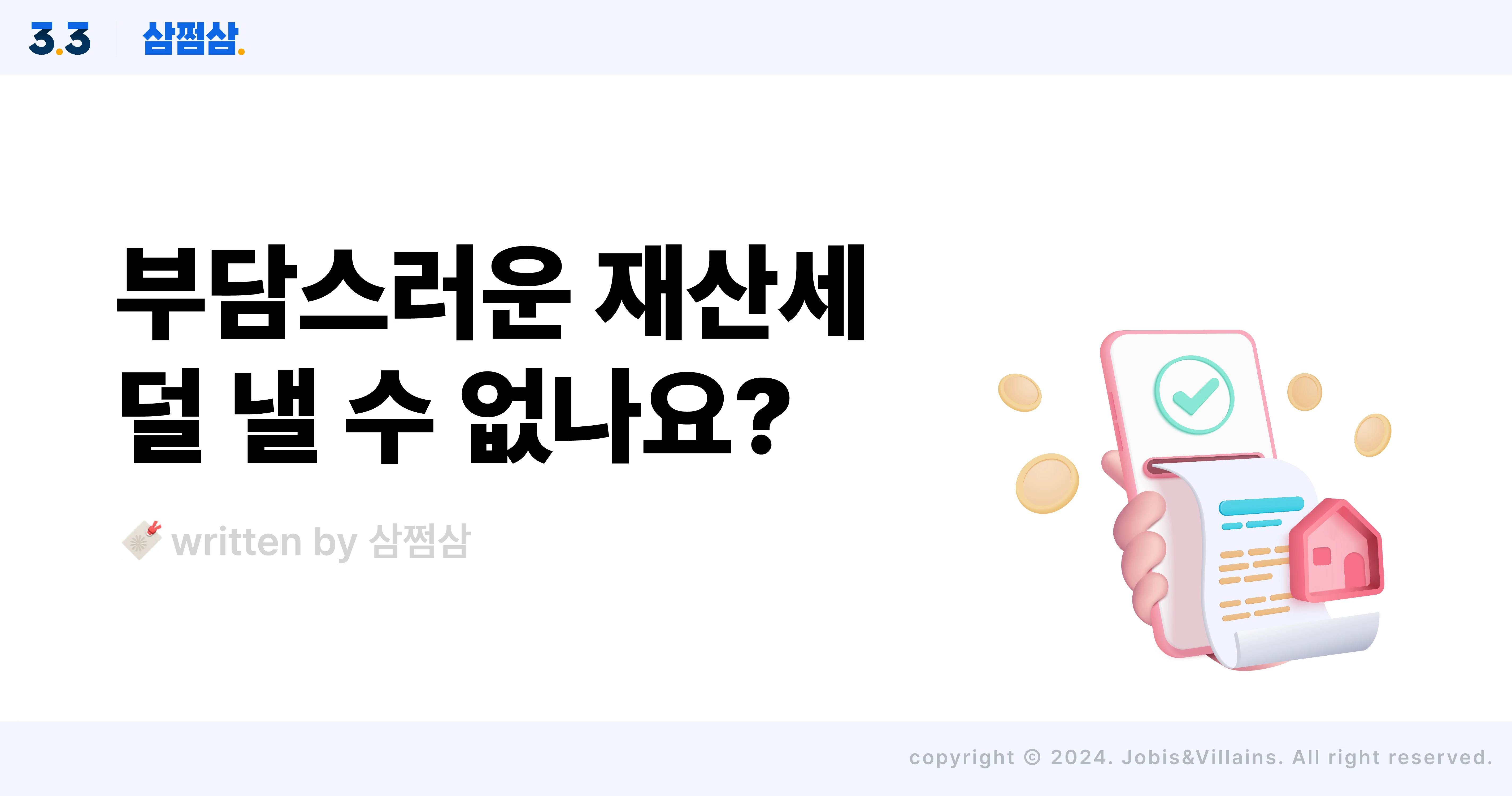 2024 재산세 납부 기간, 부과 기준 정리(ft. 절세팁) 2024 재산세 납부 기간, 부과 기준 정리(ft. 절세팁) 재산세는 토지, 건축물, 주택, 선박, 항공기 등 본인이 소유한 재산에 대해 정기적으로 부과되는 지방세예요. 재산세의 경우 우리가 신고하는 게 아니라, 지자체에서 세액을 산정해서 알려주는 거라 세금 부담을 덜 방법이 없다고 생각하시는데요. 꼭 그렇지만은 않아요. 오늘 글에서 여러분이 몰랐던 재산세 절세 꿀팁을 알려드릴게요. 재산세 부과 기준 앞서 이야기했듯 재산세는 지자체가 부과 및 징수하는 세금이에요. 과세 대상은 토지, 건축물, 주택, 선박, 항공기 등 5종입니다. 재산세는 과세 대상 5종 재산의 소재지를 기준으로 부과되는데요. 토지, 건축물, 주택은 토지나 건축물, 주택이 위치해 있는 소재지, 선박은 선적항의 소재지(선적항이 없는 경우 정계장의 소재지), 항공기는 항공안전법에 따른 등록원부에 기재된 정치장의 소재지를 기준으로 관할 시/군/구에서 부과해요. 납부세액이 1천만 원을 초과하는 재산세는 현금 납부가 어렵다면 부동산이나 주식, 채권 등으로 대신 내는 물납 제도를 활용할 수도 있어요. 이렇게 물납 납부가 유일하게 허용되는 지방세는 재산세가 유일하답니다. 재산세 납부 기간, 언제 내나요? 과세 대상 재산세 납부 기간 비고 토지 매년 9.16.~9.30. 주택 해당연도 부과할 세액의 1/2 매년 7.16.~7.31. 단, 부과할 세액이 20만 원이하인 경우, 7.16.~7.31.까지한 번에 부과, 징수 가능 나머지 1/2 매년 9.16.~9.30. 건축물, 선박, 항공기 매년 7.16.~7.31. 주택의 재산세 납부 기간은 1기(7월 16일~31일), 2기(9월 16일~30일)인데요. 액수가 20만 원 이하일 때는 1기에 한 번에 내고, 토지는 2기에, 건축물과 선박, 항공기는 1기에 납부합니다. 재산세 부과 기준일은? 재산세 부과 기준일은 매년 6월 1일이에요. 재산세에 있어 부과 기준일은 정말 중요해요. 예를들어 소유하고 있던 재산을 6월 중순 팔았다고 가정해 볼게요. 잔금일 이후 재산은 없지만 재산세 부과 기준일인 6월 1일 재산을 소유하고 있다고 판단해 재산세를 물어야 한답니다. 재산세 절세 방법 1)과세 기준일 따져보고 거래하기 첫 번째 절세는 방금 이야기한 과세 기준일과 연관이 있어요. 과세 기준일을 기점으로 재산세가 과세되므로 재산을 거래할 일이 있다면 팔 때는 5월 31일 이전에, 살 때는 6월 2일 이후로 하면 좋겠죠? 2) 재산세 자동납부 신청하기 두 번째 절세방법은 재산세 전자고지서 및 자동납부를 신청하는 거예요. 전자우편이나 휴대폰으로 고지서를 송달받고 자동납부하면 세액공제 혜택을 받을 수 있거든요. 공제내역 기존 변경 전자송달 250원 800원 자동이체 250원 800원 전자송달 + 자동이체 600원 1,600원 전자송달 신청: 이택스, 위택스, 시중은행 금융앱, 간편결제앱 자동납부 신청: 이택스. 위택스 (계좌이체 및 카드 납부 가능) 단, 감면율은 지역별로 상이할 수 있으니 세부 내용은 해당 시/군/구청에서 확인해 보시길 바랍니다. 3) 주택연금 가입하기 세 번째 절세법은 주택연금에 가입하는 거예요. 가입주택이 5억 원 이하면 재산세 35%를 감면받을 수 있고, 5억 원 초과 주택은 5억 원에 해당하는 재산세 25%를 감면받을 수 있어요. <주택연금 가입자 중 1가구 1주택자의 시간표준액별 재산세액> 시가표준액 1억 3억 5억 7억 9억 감면 전 재산세 60,000 270,000 570,000 1,050,000 1,530,000 감면 후 재산세 45,000 202,500 427,000 907,500 1,387,500 4) 임대사업자 등록하기 다주택자라면 임대사업자로 등록하는 방법도 있어요. 이 경우 임대 기간 및 전용 면적에 따라 재산세를 25~100% 감면받을 수도 있어요. 5) 카드혜택 이용하기 마지막 방법은 카드 혜택을 이용하는 건데요. 일부 카드사에서는 해당 카드로 재산세를 낼 때 포인트로 결제하거나 포인트를 적립하는 이벤트를 진행하기도 해요. 또, 카드사에 따라서는 수수료 부담 없이 무이자 할부 혜택을 받을 수 있기도 하고요. 9월에는 또 한 번 재산세 납부일이 돌아와요. 오늘 알려드린 재산세 절세 팁 꼭 활용해 보시고, 무엇보다 납부 기한 꼭 지켜서 불필요한 가산세 내는 일이 없도록 해요. -해당 콘텐츠는 2024.09.03 기준으로 작성되었습니다. -해당 콘텐츠의 내용은 일반적인 정보를 참고 목적으로만 제공하고 있으며, 개개인의 상황에 따라 달리 적용될 수 있습니다. 따라서 콘텐츠를 통해 취득한 일반적인 정보로 인한 직간접적인 손해에 대해서 당사는 법적 책임을 지지 않음을 알려드립니다. ⓒ자비스앤빌런즈, 무단 전제 및 배포 금지 재산세_납부_과세_기준일_지방세_절세_방법1.webp400 킬로바이트 재산세_납부_과세_기준일_지방세_절세_방법3.webp200 킬로바이트 재산세_납부_과세_기준일_지방세_절세_방법2.webp200 킬로바이트 재산세_납부_과세_기준일_지방세_절세_방법4.webp300 킬로바이트 재산세_납부_과세_기준일_지방세_절세_방법_직사각.webp100 킬로바이트 도움이 되었습니까? 예 아니요 1명 중 0명이 도움이 되었다고 했습니다. 어떤 부분이 아쉬웠나요? 도움말에 대한 피드백을 남겨주세요.