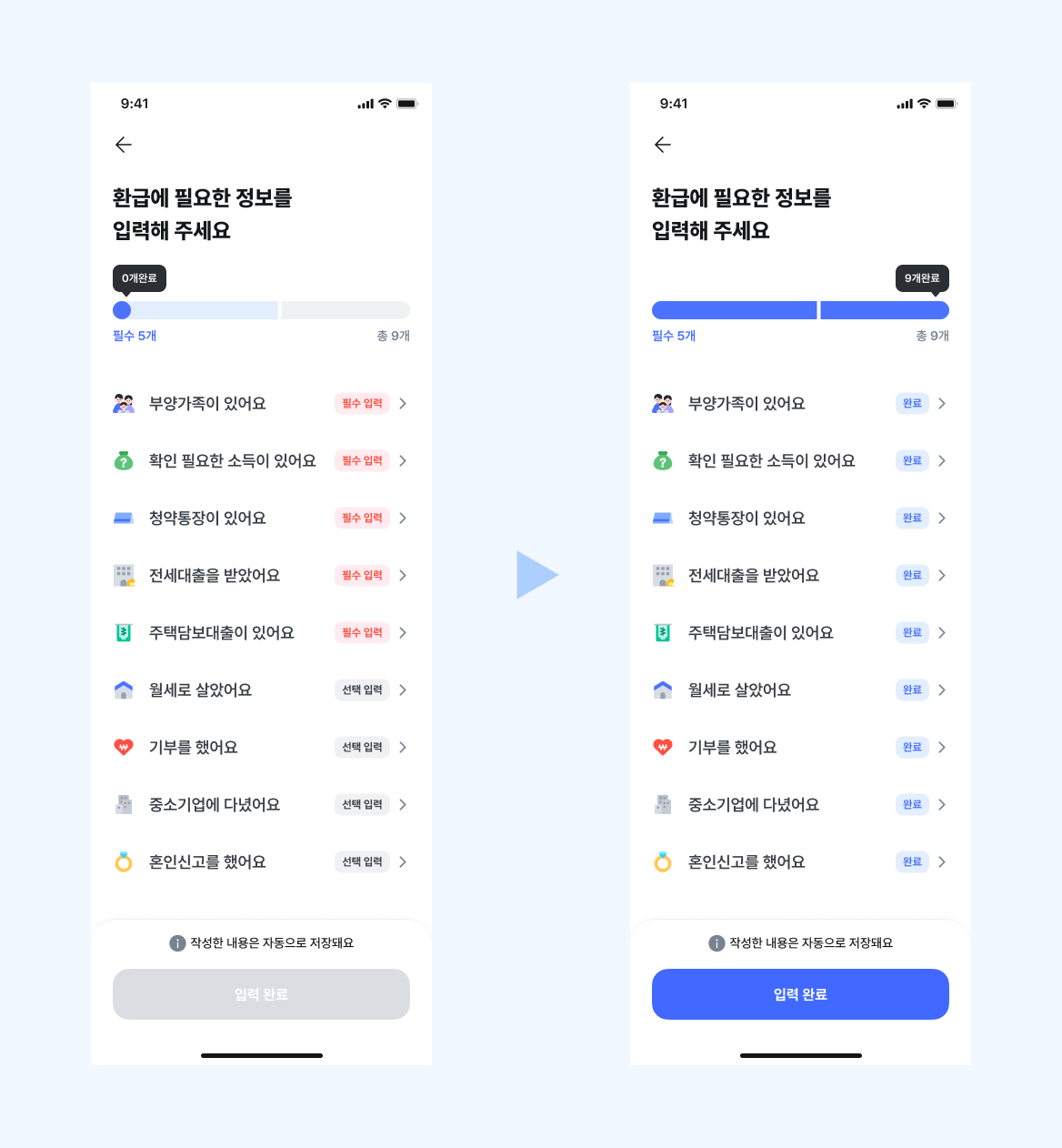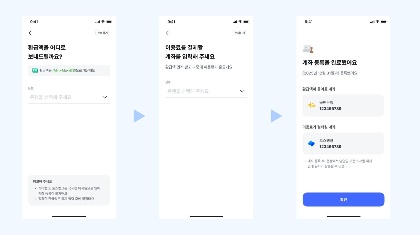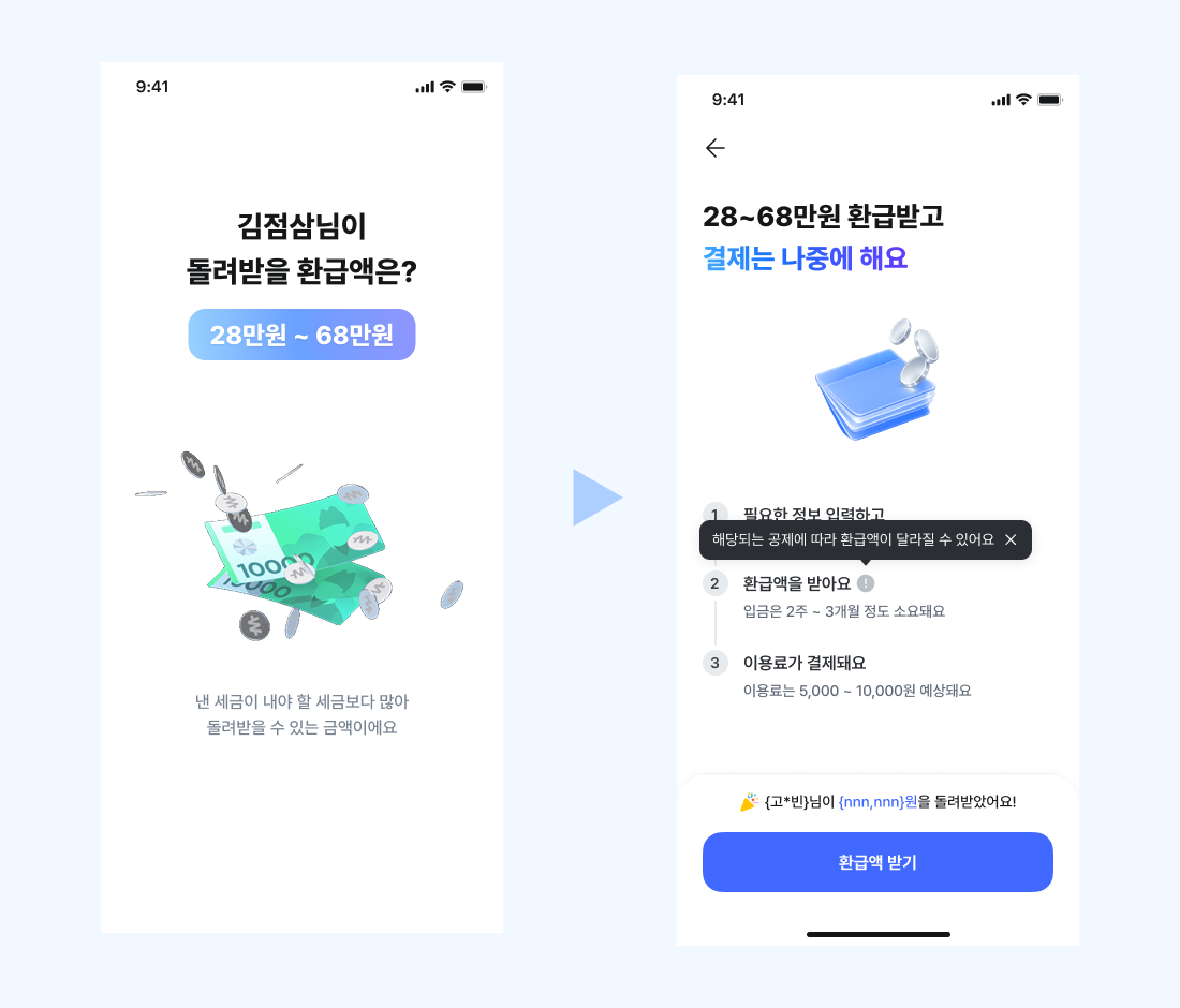 삼쩜삼 간편신고 이용방법 삼쩜삼의 대표 서비스인 '종합소득세 간편신고' 신청방법 안내드립니다.각 진행 절차에 대한 자세한 안내는 아래 목차 링크 클릭으로 바로 이동할 수 있습니다! 예상 세액 조회를 위한 간편인증 단계 추가정보 입력 단계 1. 삼쩜삼 앱 또는 웹(홈페이지) 접속 - 앱 다운로드/접속 : iOS / Android- 웹(홈페이지) 바로가기 : 삼쩜삼 홈페이지 2. 카카오톡 계정으로 회원가입 - 웹(홈페이지) 접속 시, [내 환급액 조회하기]를 클릭해 주세요.- 회원가입은 '카카오톡' 계정으로만 이용하실 수 있습니다. 3. 간편인증 및 홈택스 회원가입 - 간편인증은 내 예상 세액 조회를 위해 반드시 필요한 본인인증 절차입니다.- 홈택스 아이디가 없는 고객님은 홈택스 회원가입 후에 간편인증을 진행하실 수 있습니다. - 간편인증 수단별 도움말 : 카카오지갑 / PASS앱 4. 내 예상 세액 조회 - 최근 소득, 세금 납부 내역을 확인하고 예상 세액을 조회할 수 있어요!- 추가로 받을 수 있는 공제가 있는지 확인하기 위해 부양가족 유무 등의 정보를 확인해주세요※ 단, 예상 세액 조회 과정에서 삼쩜삼을 통해 신고가 어려운 것으로 조회될 시에는 간편신고 이용이 어렵습니다. 5. CMS 출금 동의 및 환급 계좌 입력 - 조회된 예상 세액 기준으로 신고 진행을 희망하시면, CMS 출금 동의를 받습니다.- 환급 받으실 계좌를 입력 후 이용료를 결제하실 계좌를 입력합니다.※ 케이뱅크, 토스뱅크는 국세청 미지원으로 인해 계좌 등록이 어렵습니다. 6. (선택) 공제정보 입력- 최대 절세를 위해 필요한 공제 정보를 정확하게 입력해주세요. - 월세 및 기부금 세액공제, 중소기업취업자소득세감면 적용 여부는 삼쩜삼이 검토를 도와드립니다. 🔖 삼쩜삼 공제정보 입력 방법 확인하기 7. 확정 환급액 확인 및 신고 정보 입력 - 마지막으로, 신고를 위한 필수정보를 입력해 주세요.※ '계좌없음' 선택 시에는 환급액이 계좌로 입금되지 않고 우편으로 통지서가 발송됩니다.※ '계좌없음'을 선택하여도 홈택스 내에 이미 등록한 계좌가 있으면 해당 계좌로 환급될 수 있습니다.참고 : [홈택스] 기 등록된 환급계좌 해지 방법 8. 간편신고 신청 완료! 🙌- 신청이 완료되면 삼쩜삼의 검토/신고 절차가 진행됩니다. (영업일 기준 약 3~10일 소요)- 이후 진행 결과는 카카오 알림톡 or 앱 알림으로 안내드리오니, 알림 설정이 되었는지 미리 확인해 주세요!- 단, 삼쩜삼 검토/신고 과정에서 추가 확인이 필요한 경우에는 시간이 추가로 소요될 수 있습니다.※ 환급을 받으신 후에는 꼭 앱에서 환급 여부를 확정해 주세요! 확정이 늦어지면 일정 기간(123일) 후 자동으로 이용료가 출금될 수 있습니다.※ 종합소득세 환급 고객님의 경우 환급계좌로 신고된 환급금이 입금될 예정이오니 조금만 기다려주세요! 📌 기한후신고(2021~2025년 귀속) : 신고완료 후 최대 3개월 이내📌 정기신고(2025년 귀속) : 6월 말 ~ 7월 초 📌 경정청구 : 신고완료 후 평균 2개월 이내 ※ 종합소득세 납부 고객님의 경우 도움말(클릭)을 참고하여 반드시 5월 정기신고 기한내에 꼭 직접 납부해주세요. 도움이 되었습니까? 예 아니요 0명 중 0명이 도움이 되었다고 했습니다. 어떤 부분이 아쉬웠나요? 도움말에 대한 피드백을 남겨주세요.