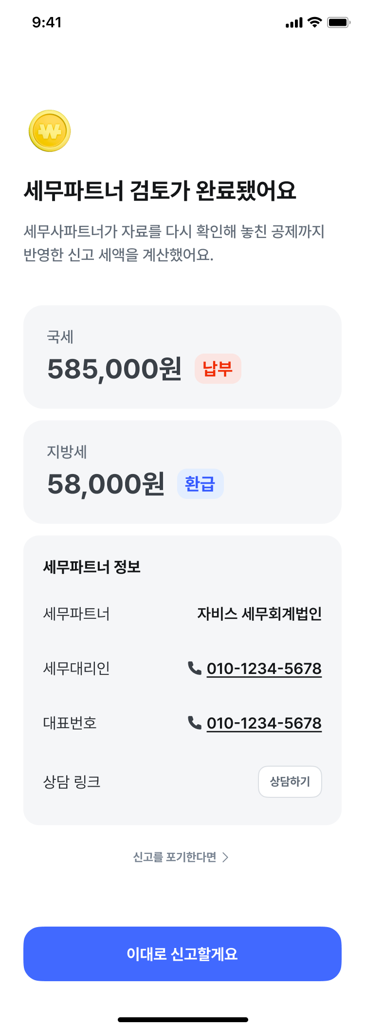 세무파트너 신고|맞춤검토 대상자 신고 완료 방법 (‘이어서 신고 진행하기’) ■ 맞춤검토 신고 완료를 위한 필수 안내 맞춤검토 신고는 고객님께서 최종 신고 여부를 선택해주셔야 정상적으로 완료됩니다.신고 여부를 선택하지 않을 경우, 해당 신고 건은 자동으로 취소 처리되며 환불이 불가합니다. 또한 세무파트너 신고 대상자는 종합소득세 신고 대상에 해당하므로,확정 세액(결정 세액) 확인 이후 신고를 진행하지 않을 경우 불이익이 발생할 수 있습니다.아울러 세무파트너가 이미 자료 검토 및 세액 계산을 완료한 상태이므로,취소가 진행되더라도 이용료 환불이 어려울 수 있는 점 참고 부탁드립니다.따라서 삼쩜삼 앱 또는 알림톡에서 발송된 ‘이대로 신고할게요’ 버튼을 반드시 눌러 신고 완료 부탁드립니다. 도움이 되었습니까? 예 아니요 0명 중 0명이 도움이 되었다고 했습니다. 어떤 부분이 아쉬웠나요? 도움말에 대한 피드백을 남겨주세요.